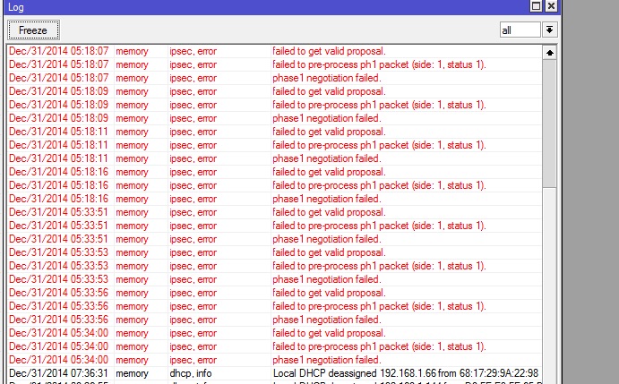 Antoshka-klin Posted January 5, 2015 Доброго времени суток! На маршрутизаторе поднято l2tp+ipsec. Периодически в логах маршрутизатора (mikrotik ccr1036-12g-4s, ОС - 6.20) проскакивает ошибка ipsec (скрин в прикрепленном файле). Проскакивает независимо от того, подключен кто то или нет. Не могу понять с чем это может быть связано. Поможите разобраться? Share this post Link to post Share on other sites More sharing options...