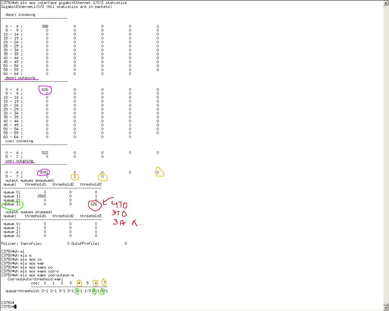 NikAlexAn Posted February 13, 2015 Posted February 13, 2015 А sh mls qos, sh policy-map gi1/0/1 что показывают? Глобальные команды mls qos какие? Вроде как на свичах надо ещё и глобальные mls qos команды какие то чтоб в зависимости от dscp в разные выходные очереди распихать. Конкретно в вашем случае надо ли полиси мапом dscp выставлять, может просто cos rewrite в нужный на входящем порту? Вставить ник Quote