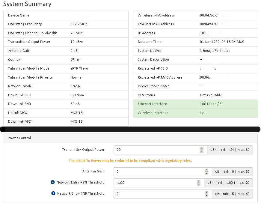 adron2 Posted May 22, 2015 Posted May 22, 2015 в ePMP slave режиме мощность больше 19 не выставляется. Хотя руками указывал и 25 и 29! Пишет что работает на 19 и все. И перекос сигнала в Downlink по отношению к Uplink явно указывает что slave работает на пониженной мощности. К ePMP master вопросов нет. Там четко 29 выставляется и работает. Прошивки пробовал 2.4.0, 2.4.2. Это крайне важно чтобы мощность была выше 19. И особенно для uplink-а!