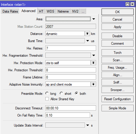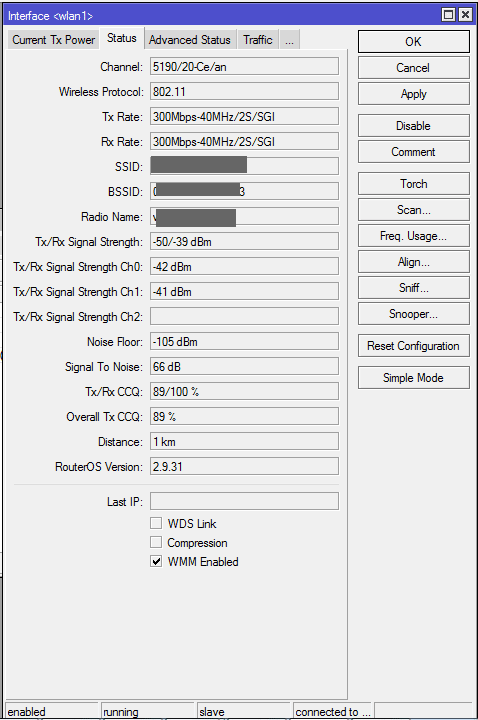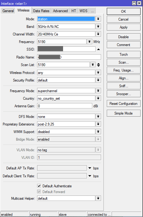 Di1Worker Posted June 17, 2015 В связи с переходом на Микротики с UBNT - сознательный выбор после долгих наблюдений, изучения данного форума и конструктивных постов Saab95 меняется линк с NanoBeamM5-400 --> NanoBeamM5-400 на RB922-UAGS-5HPacD-NM --> RB922-UAGS-5HPacD-NM. "На столе" микротики себя ведут прилично, все "зачетно". Один настроен как AP bridge, второй клиент в station bridge. Но вырубать линк для последовательной смены с обоих концов "не кашерно". Хотелось бы сделать "мягкий переход" - сменить станцию клиента на RB922, потом AP. Для этого отключен AirMax на UBNT с подающей стороны, на клиенте RB922 включена поддержка "всего и вся" на время переходного процесса, DataRates в Default, в HT включены оба чейна на туда-сюда, на WDS - WDS mode dynamic в WDS Default bridge имеющийся bridge1. MT в station bridge не соединяется, меняю на station. Коннект. На UBNT в списке станций микротик появляется, по скринам "все пучком", но данные не ходят совсем. Радио линк есть, но пинги ни с UBNT на MT ни обратно встроенными средствами девайсов или через езернет с компиков не ходят :( По постам понятно, что у людей аналогичные MT-UBNT схемы работают, а тут... что-то я затупил или именно у этой связки непреодолимая антипатия и полное отторжение извращенского варианта :) Посоветуйте пожалуйста, может по неопытности на стандартные грабли нарвался? Скрины: Вставить ник Quote Ответить с цитированием Share this post Link to post Share on other sites More sharing options...