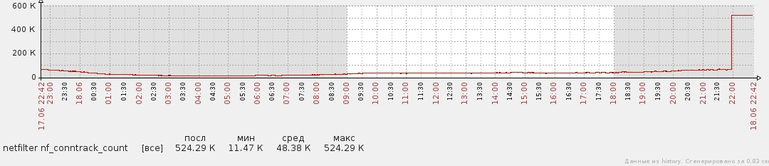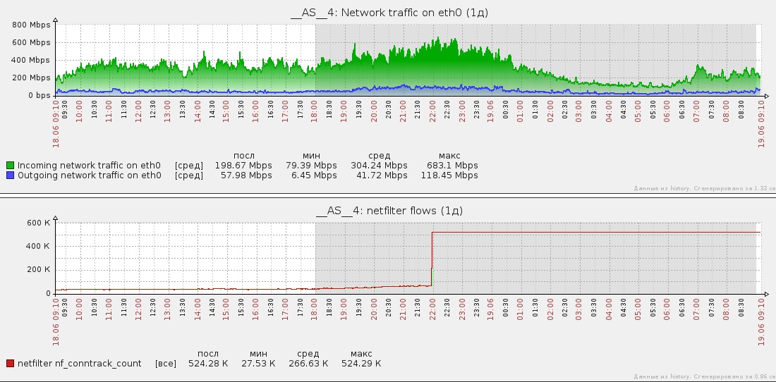 entwine Posted June 19, 2015 Posted June 19, 2015 (edited) Доброе время суток Есть проблема. Возможно кто-то уже сталкивался с чем-то подобным или знает как продиагностировать. Сервер, работает под CentOS 6, NAT - iptables. Обслуживает 1-1.5к клиентов, максимальная загрузка процессора была (до недавнего времени) - 18%, количество сессий - до 92к. И вот, в один момент, сессий становится 524к, процессор пригружается до 31% (но, вскоре, возвращается в норму), Трафик на интерфейсах до 700M-rx/100M-tx почти не изменился. а количество сессий остается на уровне 524к Что это может быть и как найти причину аномалии? Edited June 20, 2015 by entwine Вставить ник Quote