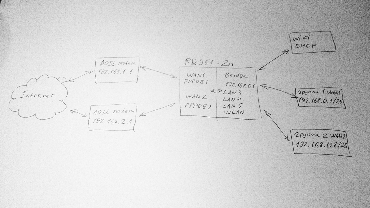 Saab95 Posted July 8, 2015 Posted July 8, 2015 Вам нужно поставить 3 микротика - первые 2 подключаете каждый к своему PPPoE соединению, настраиваете NAT. Третий подключаете к двум первым, для связи между ними выделяете две подсети /30 и включаете OSPF. На 3 микротике либо ничего не делаете, т.к. первые 2 анонсируют дефолтный маршрут и трафик сам распараллелится, либо настраиваете маркировку маршрутов с отправлением нужных серых IP по своему каналу, делать это можно либо автоматически через маркировку по определенным правилам, например разбив все адреса абонентов на 2 группы, либо вручную, добавив нужные адреса в свои адрес листы. Вставить ник Quote