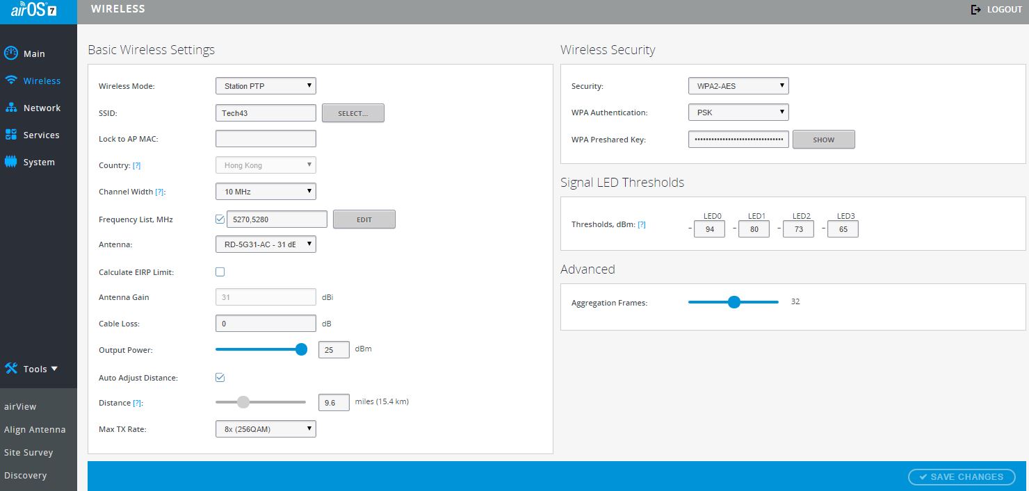 [anp/hsw] Posted July 20, 2015 1, 2, 3 - скрины с базы Вы находитесь в Гонконге? Если нет, но не ставьте его в качестве страны, и вообще, найдите любую страну, но без DFS (оно указывается в скобочках при выборе частоты). Auto adjust distance уберите (на базе и на клиенте). Выставите дистанцию померив расстояние через wikimapia/google maps/что там у вас в моде в Гонконге +10%. 4, 5, 6 - с клиента Ваша частота 5280 (а также соседние +/-10мгц) чем-то заняты со стороны базы (т.е. клиент видит этот шум соей антенной). Попробуйте другую. А также: 1. Настройте антенны друг на друга. 2. Сделайте суточный график изменения сигнала, шума и RX/TX rate любым доступным средством мониторинга. Share this post Link to post Share on other sites More sharing options...