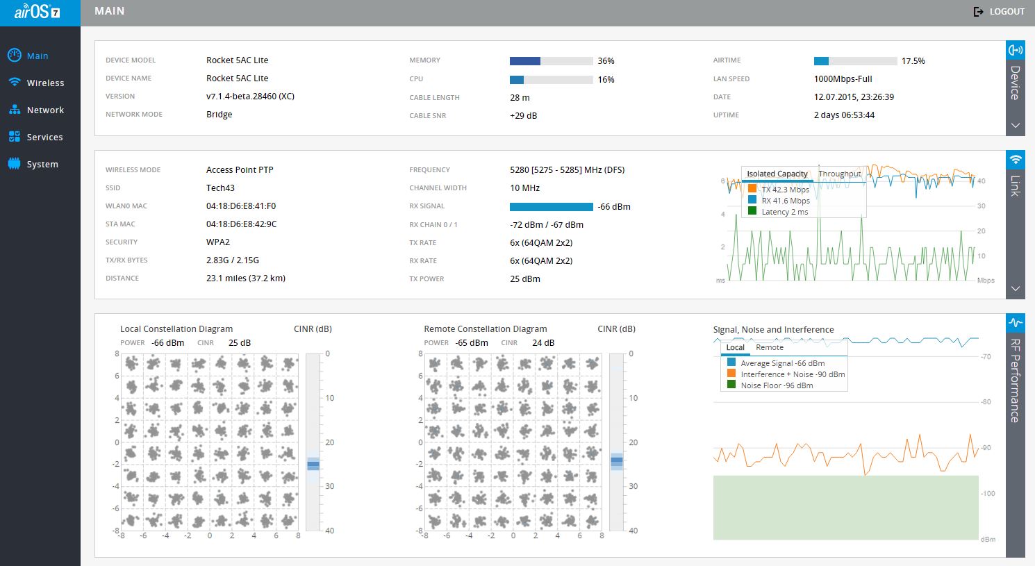 slv700 Posted July 20, 2015 Да нет там помех на рабочей частоте , неужели не видно Interference+ Noise -92 дБм? Сигнал, согласен, где то 10 дБ потеряно, но это может быть вследствие переотражений от воды ( залив), не факт что плохая юстировка. Но покрутить антенны надо все же попробовать. Но даже на данном сигнале, хороший SINR 25-26 Дб, поднялась хорошая модуляция 64QAM5/6 -3/4, c какого хрена тогда не выдает даже при таких условиях должную для 64QAM скорость и при увеличении канала лучше не становится? Можете пояснить, специалисты? Share this post Link to post Share on other sites More sharing options...