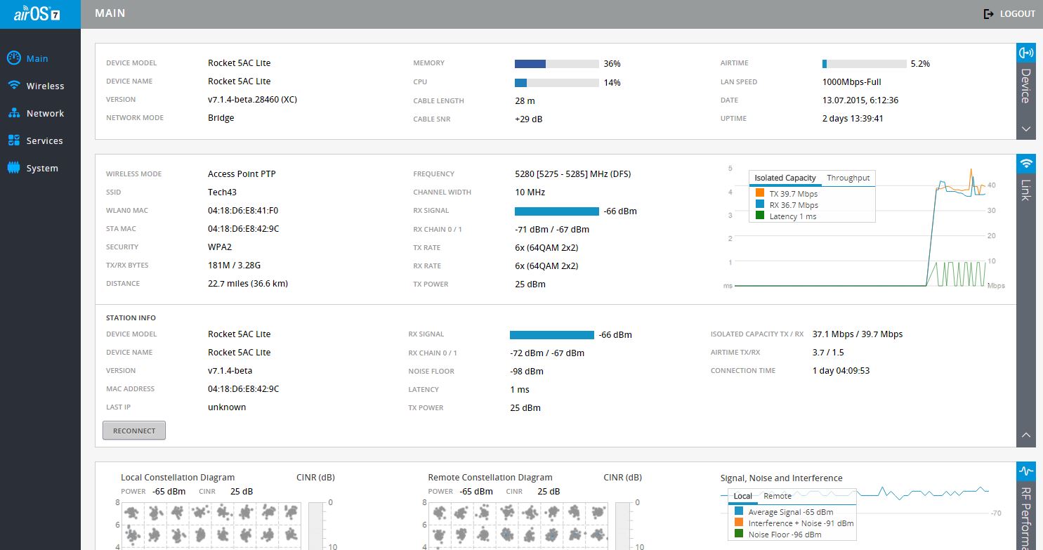 [anp/hsw] Posted July 20, 2015 а что значит DFS? DFS значит, что устройство будет освобождать частоту при наличии более приоритетного передатчика (радар, самолеты, итд), а также выберет новую частоту не ранее чем через 1 минуту после окончания трансляции на старой. В большинстве развитых стран это обязательное требование. У нас - нет. Вообще - оно не мешает обычно, но для настройки лучше поставить без DFS, чтобы глюки какие-нибудь не словить. акую порекомендуете, и как лучше смотреть со стороны клиента или базы, или анализировать и тот и другой график? Видите красные палки на графиках? вот и выбирайте от них частоту подальше. Да, эта частота должна быть "подальше" на обоих графиках, у вас таких полно - запишите на бумажку 5-6 таких, и потестируйте скорость/стабильность на каждой. Что касается дистанции, только на 10 МГц канале доступна моя дистанция (чем шире канал тем меньше дистанция, а при автоматическом определении всегда почти верно показывает) Да, дистанцию можете оставить на авто после того, как переключите с 10мгц на что-нибдуь другое. На 10мгц лучше поставить вручную. (Обязательно попробую выровнять, ехать очень далеко, это через залив 36,5 км, а по дороге 180 км, из них почти 40 грунтовки) Потратьте уж пару часов на настройку. Добивайтесь идеала (с каждой стороны). За одно и сделайте подробные фото установки, может что-то мешает на пути, или вы сделали что-то совсем неправильное. (посоветуйте способ) Установите ubnt aircontrol, она довольно простая, и руководств по ней много. Share this post Link to post Share on other sites More sharing options...