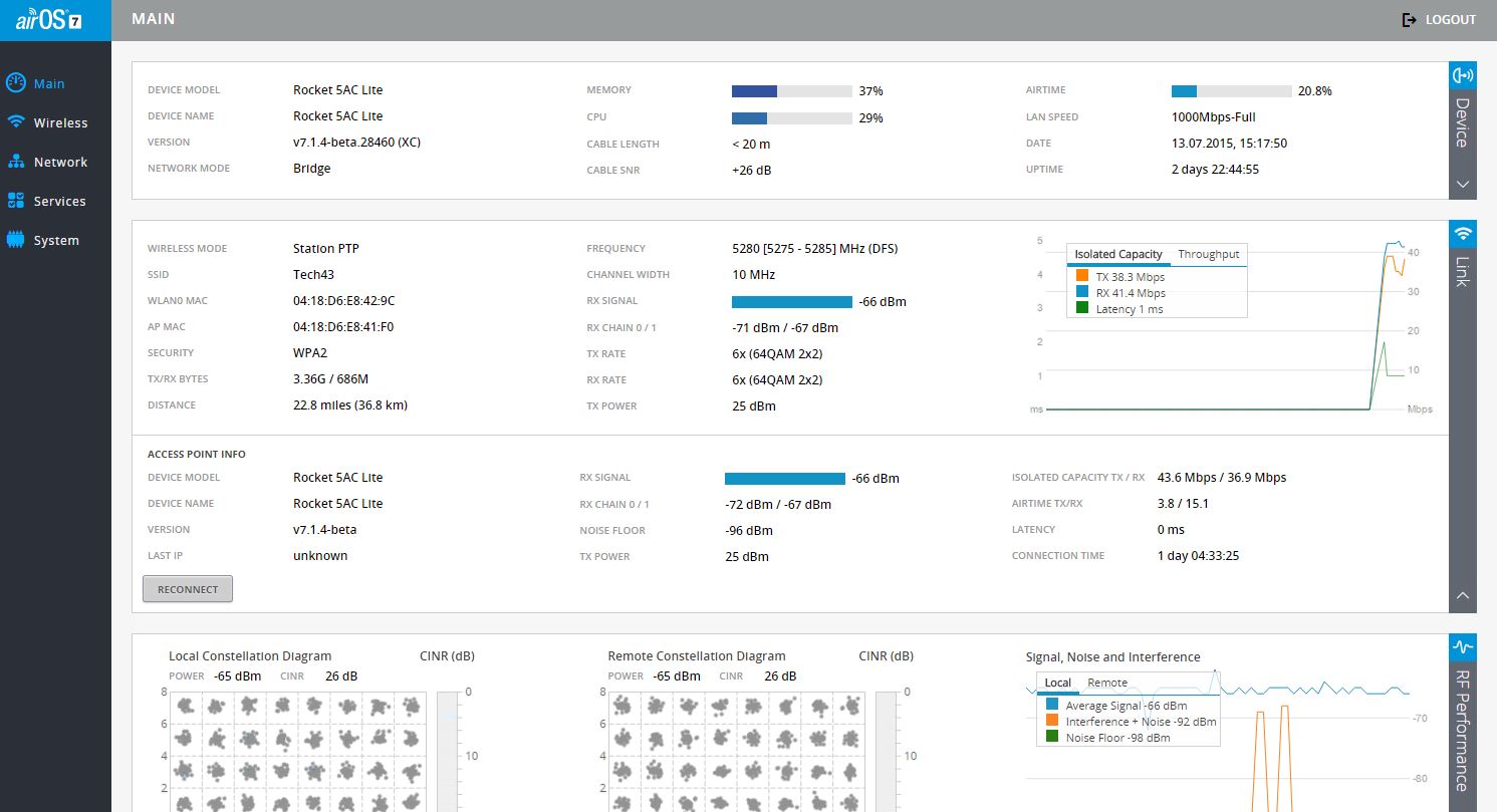 iSasha Posted July 20, 2015 Уважаемые специалисты, подскажите может быть кто то сталкивался с подобной ситуацией: Два устройства Rocket Dish 5G-31 AC + Rocket M5 AC Lite, дальность линка 36,5 км, видимость прямая (через залив). Калибровали на мощности 20dBm с шириной канала 10МГц, с обоих сторон вывели максимально точно, сигнал был -71. После увеличения мощности до 23 dBm уровень сигнала поднимается до -66 (то есть вполне нормально), при этом скорость подключения указывается в пределах 40-45 мегабит в обе стороны. При проверке интегрированным спидтестом в одну сторону 30-35 в другую 30-35 мегабит, то есть практически симметрично, но при попытке приема/отправки данных, скорость в одну из сторон в 2 меньше. Прошивка была 7.1.1, после перепрошили на 7.1.4 beta. 1. При конфигурации беспроводной сети вводится параметр антенны (выбирается из списка в новой прошивке) и так же можно вводить потери в кабеле (вопрос, а как их рассчитать, никогда не сталкивались, в мануале написано что это влияет на скорость передачи данных). 2. В течении дня наблюдается странная картина, то мощность сигнала резко падает, то возвращается на прежний уровень, каналов перебрали очень много, на всех картина та же, отличия только в том что уровень максимального сигнала разный (в зависимости от зашумленности диапазона). Что это может быть и как это лечится? 3. При монтаже не получилось выставить уровень (который расположен на антеннах) из за специфической особенности места, если я правильно понимаю то расхождение в сигнале 0 и 1 получается в среднем -72/-68 (расхождение 4-5 dBm) именно из за этого? Это может влиять на скорость, уровень сигнала и стабильность? 4. На прошивке 7.1.1 максимальную мощность можно выставить до 27 dBm, но в статусе указывается только 23 (либо меньше), после 23 сколько бы не выставили сигнал не улучшается никак, в прошивке 7.1.4 beta в статусе отображается и 24 и 27, но на уровень сигнала больше 23 никак не влияет. Пробовали устанавливать шире канал, при этом мощность приема соответственно уменьшается (канал разгоняется но не значительно), а так как существует проблема ослабления сигнала (непонятного), то разгонять не сильно то и можно. 5. Пробовал устанавливать ширину канала в 30 МГц, при хорошем уровне сигнала получалось разогнать канал до 80 мегабит, причем опять же странно, внутренний спидтест показывает что канал симметричен, а по факту в одну из сторон в 2 раза меньше. 6. Процессор и память при любых тестах не поднимаются выше 30-40 процентов, то есть ресурсов достаточно. 7. Модуляция в основном держится на уровне 6х, иногда прыгает до 8х, и при ухудшении канала до 4х. 8. И еще вопрос, чем отличается диапазон DFS от обычного? Буду благодарен за любую помощь. Спасибо. Share this post Link to post Share on other sites More sharing options...