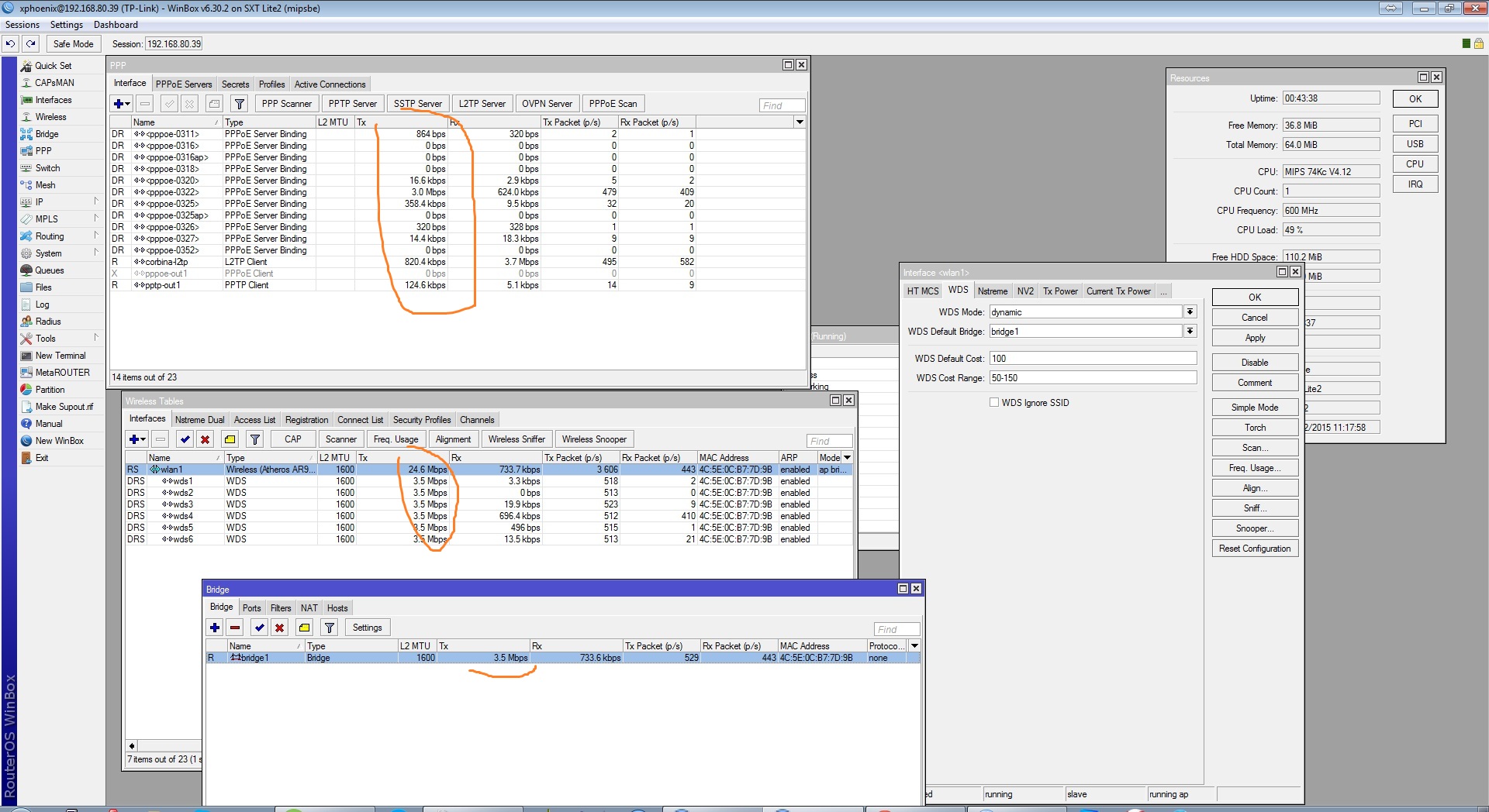 xphoenix Posted August 12, 2015 Posted August 12, 2015 (edited) Приветствую, обновили сетку до 6.30+ в связи изменениями маршрутизации билайна (кто сталкивался, знает) Теперь на некоторых базах наблюдаем такую картину: wlan1 упирается в полку и как будто рассылает мультикаст на все подключенные клиенты, хотя качает в этот момент только 1 клиент. Схема стандартная на базах bridge1(wlan1) pppoe serv, клиенты station wds(так же bridge1, и на нем пппое). Кроме этого имеются клиенты подключенные через коллективные точки (bridge=wlan1+ether1, с фильтрами дроп всё кроме пппое и дискавери), пока подозрения падают именно на них. Еще заметил что с переходом на 6.30.2 на некоторых бриджах(на базах) автоматом поставилось rstp, выключение не помогло. мультикаст не гоняем, айпитв нет. package стандартный, иногда даже вырубаем ненужное. используем wireless-fp, на wireless-cm2 пока не переходили. Edited August 12, 2015 by xphoenix Вставить ник Quote