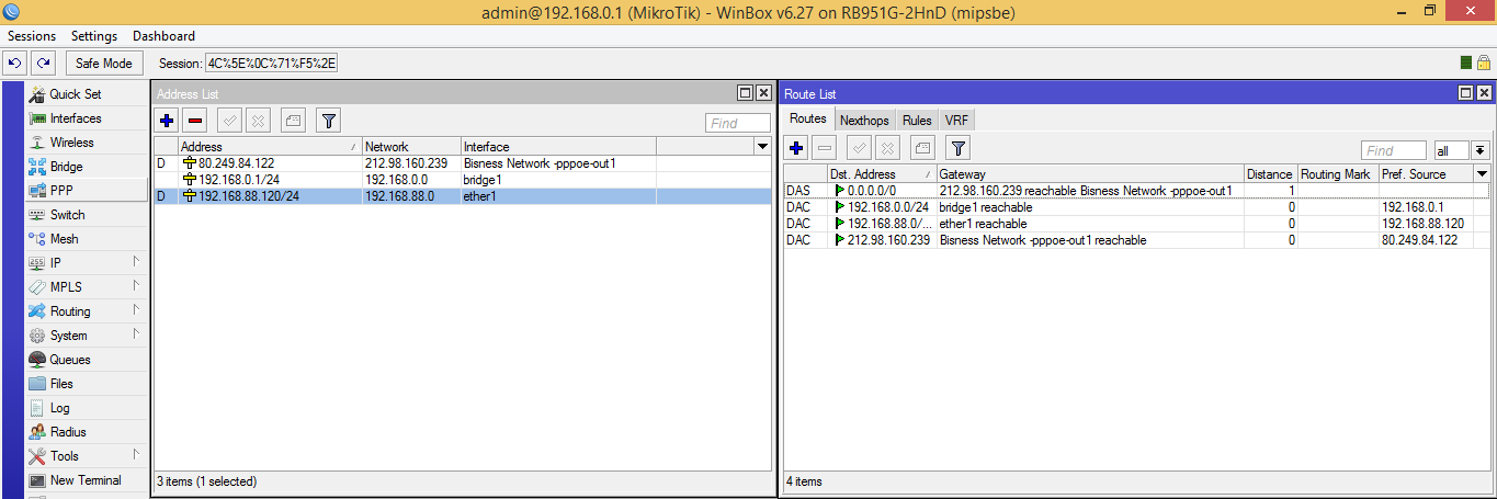 Saiko Posted August 31, 2015 Посмотрите в IP -> DHCP client. Есть подозрение, что у Вас микротик подхватывает от другого микротика адрес и маршрут. Это вполне реально, если не отменяли стартовый конфиг. Share this post Link to post Share on other sites More sharing options...