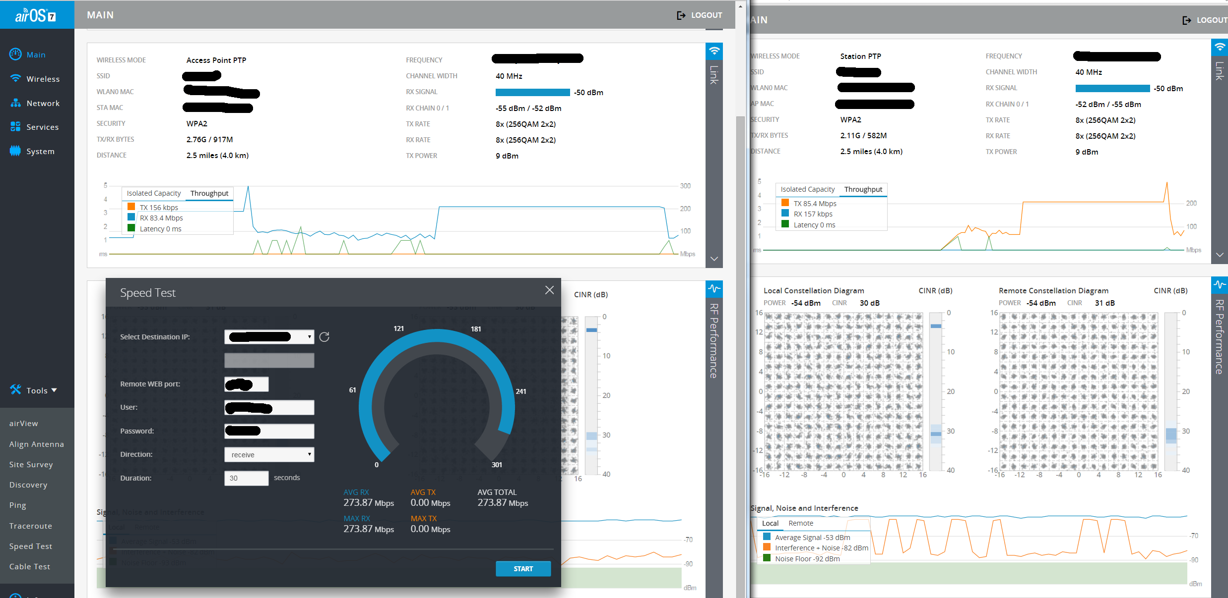 slv700 Posted October 7, 2015 Posted October 7, 2015 ' timestamp='1444214263' post='1184146'] поскольку не учитывает потери пакетов в канале. вот вам графики во время теста с обоих сторон, пакеты долетают до второй стороны полностью, теперь хоть заучитывайтесь. да, прямая полоса на графике это не полка по трафику (ну не может же прием быть больше, чем генерируется на той стороне :) это полка по cpu. httpd в этот момент витает где-то в облаках, и не успевает отдать данные до таймаута, поэтому график рисует последнее полученое значение где-то в районе старта. на дуплексном тесте хорошо видно, что если до таких скоростей не доводить, то данные в рисовалку графика успевают попадать (в прошивке 7.1.4 возможно пофикшено, надо проверить) Неужели вам нужно обьснять, что пакеты могут не только теряться , но и "долетать" до адресата битыми, что контролирутся CRC и какой конкретно битый пакет в агрегированом фрейме указыается в групповом ACK? Тестируйте канал на убнт пакетами TCP,поскольку тесты UDP ( встроенный тест убнт) , у которых вообще нет ACK для системы с высоким PER/BER ( что есть убнт АС) неадекватны. И посмотрите, у вас помеха с одной стороны -82 dBm c CINR 30 dBm. Этот канал может без потерь работать только на 64QAM 5/6, как простой N. Вставить ник Quote