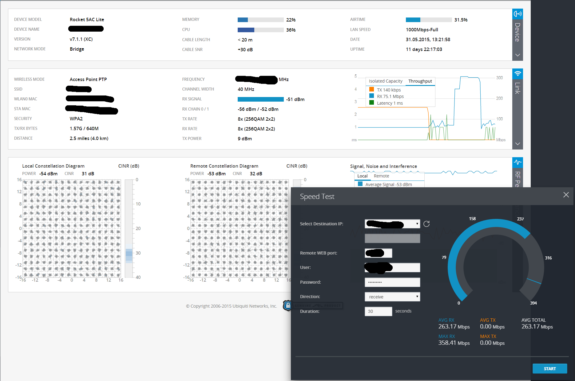 [anp/hsw] Posted October 7, 2015 Posted October 7, 2015 на rocketAC lite 4км линк дает в 40мгц 230 мегабит, capacity при этом показывает 260. в 80мгц помню тест гонял, там было явно больше, около 400, но живого трафика у меня столько в ту сторону нет, чтобы проверить. N в тех же условиях давал 180 на полосе 40мгц. Вставить ник Quote