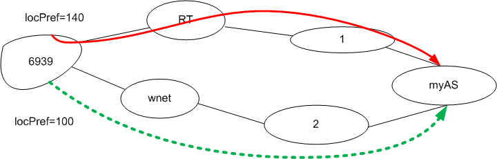 Mechanic Posted October 17, 2015 Posted October 17, 2015 сейчас трафик с as6939 едет через РТ, тк установлен localpref140 у 6939 хочу чтобы траф ехал по зеленой трассе Можно ли влиять на трафик со стороны удаленного пира ? Вставить ник Quote
