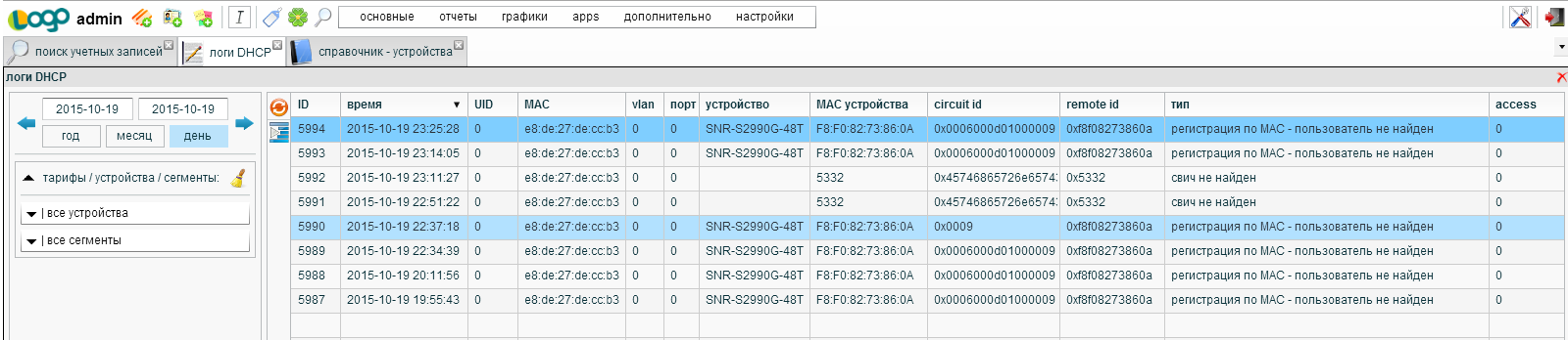 BAHbKA Posted October 19, 2015 Posted October 19, 2015 (edited) Доброго времени суток товарищи. Мучаюсь с настройками опции 82 Постоянно перегружаю коммутатор и это очень долго так как не могу понять как почистить статическую запись на порту SNR-S2990G-48T(config)#show mac-address-table Read mac address table.... Vlan Mac Address Type Creator Ports ---- --------------------------- ------- ------------------------------------- 2 00-15-17-21-45-cd DYNAMIC Hardware Ethernet1/0/48 2 f8-f0-82-73-86-0a STATIC System CPU 3 00-0c-29-35-ed-e2 DYNAMIC Hardware Ethernet1/0/45 3 00-0c-29-7a-3b-5c DYNAMIC Hardware Ethernet1/0/45 3 00-15-17-21-45-cd DYNAMIC Hardware Ethernet1/0/48 5 00-15-17-21-45-cc DYNAMIC Hardware Ethernet1/0/47 5 28-6e-d4-0f-7f-51 DYNAMIC Hardware Ethernet1/0/52 13 00-0c-29-ca-32-52 DYNAMIC Hardware Ethernet1/0/46 13 00-15-17-21-45-cd DYNAMIC Hardware Ethernet1/0/48 13 e8-de-27-de-cc-b3 STATIC App Ethernet1/0/9 Тестовый абонент включен в 9 порт в 13 VLAN И биллинг не подхватывает с CircuitID номер порта и VLAN хотя шаблон настроен верно C D-Link работает всё отлично, SNR отказывается работать Конфиг SNR !no service password-encryption ! hostname SNR-S2990G-48T ! authentication logging enable ! username admin privilege 15 password 0 admin ! authentication line console login local ! ! ! ! ! no ip http server ! service dhcp ! ip forward-protocol udp bootps ! ! ip dhcp snooping enable ip dhcp snooping vlan 13 ip dhcp snooping binding enable ip dhcp snooping binding arp ! ip dhcp snooping information enable ip dhcp snooping information option allow-untrusted ip dhcp snooping information option subscriber-id format hex ip dhcp snooping information option self-defined subscriber-id format hex ! ! ! ! ! ! Interface Ethernet0 ! ! ! vlan 1 ! vlan 2 name manager ! vlan 3 name inter3 ! vlan 5 name BTKVLAN ! vlan 6 name VelcomVLAN ! vlan 7 name NCOTBYIX ! vlan 9 name IPTVVLAN ! vlan 11 name user11 ! vlan 12 name user12 ! vlan 13 name user13 ! vlan 14 name user14 ! vlan 15 name user 15 ! vlan 16 name user16 ! vlan 17 name user17 ! vlan 18 name user18 ! vlan 19 name user19 ! vlan 20 name user20 ! vlan 21 name user21 ! vlan 22 name user22 ! vlan 23 name user23 ! vlan 24 name user24 ! vlan 25 name user25 ! vlan 26 name user26 ! vlan 27 name user27 ! vlan 28 name user28 ! vlan 29 name user29 ! vlan 30 name user30 ! vlan 31 name user31 ! vlan 32 name user32 ! vlan 33 name user33 ! vlan 34 name user34 ! vlan 35 name user35 ! vlan 36 name user36 ! vlan 37 name user37 ! vlan 38 name user38 ! vlan 39 name user39 ! vlan 40 name user40 ! vlan 41 name user41 ! vlan 42 name user42 ! vlan 43 name user43 ! vlan 44 name user44 ! vlan 45 name user45 ! vlan 46 name user46 ! vlan 47 name user47 ! vlan 48 name user48 ! vlan 49 name user49 ! vlan 50 name user50 ! Interface Ethernet1/0/1 description user13VLAN switchport access vlan 13 loopback-detection specified-vlan 1-4094 ip dhcp snooping binding user-control ip dhcp snooping binding user-control max-user 1 ! Interface Ethernet1/0/2 description user13VLAN switchport access vlan 13 loopback-detection specified-vlan 1-4094 ip dhcp snooping binding user-control ip dhcp snooping binding user-control max-user 1 ! Interface Ethernet1/0/3 description user13VLAN switchport access vlan 13 loopback-detection specified-vlan 1-4094 ip dhcp snooping binding user-control ip dhcp snooping binding user-control max-user 1 ! Interface Ethernet1/0/4 description user13VLAN switchport access vlan 13 loopback-detection specified-vlan 1-4094 ip dhcp snooping binding user-control ip dhcp snooping binding user-control max-user 1 ! Interface Ethernet1/0/5 description user13VLAN switchport access vlan 13 loopback-detection specified-vlan 1-4094 ip dhcp snooping binding user-control ip dhcp snooping binding user-control max-user 1 ! Interface Ethernet1/0/6 description user13VLAN switchport access vlan 13 loopback-detection specified-vlan 1-4094 ip dhcp snooping binding user-control ip dhcp snooping binding user-control max-user 1 ! Interface Ethernet1/0/7 description user13VLAN switchport access vlan 13 loopback-detection specified-vlan 1-4094 ip dhcp snooping binding user-control ip dhcp snooping binding user-control max-user 1 ! Interface Ethernet1/0/8 description user13VLAN switchport access vlan 13 loopback-detection specified-vlan 1-4094 ip dhcp snooping binding user-control ip dhcp snooping binding user-control max-user 1 ! Interface Ethernet1/0/9 description user13VLAN switchport access vlan 13 loopback-detection specified-vlan 1-4094 ip dhcp snooping binding user-control ip dhcp snooping binding user-control max-user 1 ! Interface Ethernet1/0/10 description user13VLAN switchport access vlan 13 loopback-detection specified-vlan 1-4094 ip dhcp snooping binding user-control ip dhcp snooping binding user-control max-user 1 ! Interface Ethernet1/0/11 description user13VLAN switchport access vlan 13 loopback-detection specified-vlan 1-4094 ip dhcp snooping binding user-control ip dhcp snooping binding user-control max-user 1 ! Interface Ethernet1/0/12 description user13VLAN switchport access vlan 13 loopback-detection specified-vlan 1-4094 ip dhcp snooping binding user-control ip dhcp snooping binding user-control max-user 1 ! Interface Ethernet1/0/13 description user13VLAN switchport access vlan 13 loopback-detection specified-vlan 1-4094 ip dhcp snooping binding user-control ip dhcp snooping binding user-control max-user 1 ! Interface Ethernet1/0/14 description user13VLAN switchport access vlan 13 loopback-detection specified-vlan 1-4094 ip dhcp snooping binding user-control ip dhcp snooping binding user-control max-user 1 ! Interface Ethernet1/0/15 description user13VLAN switchport access vlan 13 loopback-detecti
