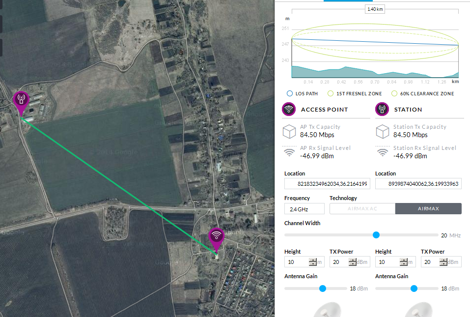 Alex_Sor Posted October 23, 2015 Posted October 23, 2015 Приветствую. Посоветуйте пожалуйста железки под бридж в полях, фермеры озадачили. Прямая видимость вроде есть, эфир пока не исследовали. Хотелки: Нужно полноценных 40-50Мбит под 2-3 камеры(HD) + пару компов в сети. Минимум проблем с законом, т.е. высота подвеса 10м, частота 2,4GHz, мощьность до 100mW, если это конечно возможно (хотя понимаю, что нужно строить в 5GHz). Грозозащиту, какую? "земля" есть в обеих точках. Хотелось бы по принципу "поставил и забыл" :) Не обязательно сильно бюджетно по деньгам. Потыкал калькулятор ubnt, картинку прилагаю. Вставить ник Quote
