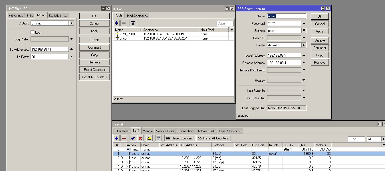 xxxdistortion Posted November 13, 2015 Уважаемые знатоки есть RB 1100 с внешником 45.46.21.13 c внутренней сетью 192.168.88.1 к нему коннектится по ВПН роутер Zyxel(через 4Г модем билайн) и получает IP 192.168.88.41 88.41 пингуется микротиком все ок не могу пробросить порт на 88.41 помогите Share this post Link to post Share on other sites More sharing options...