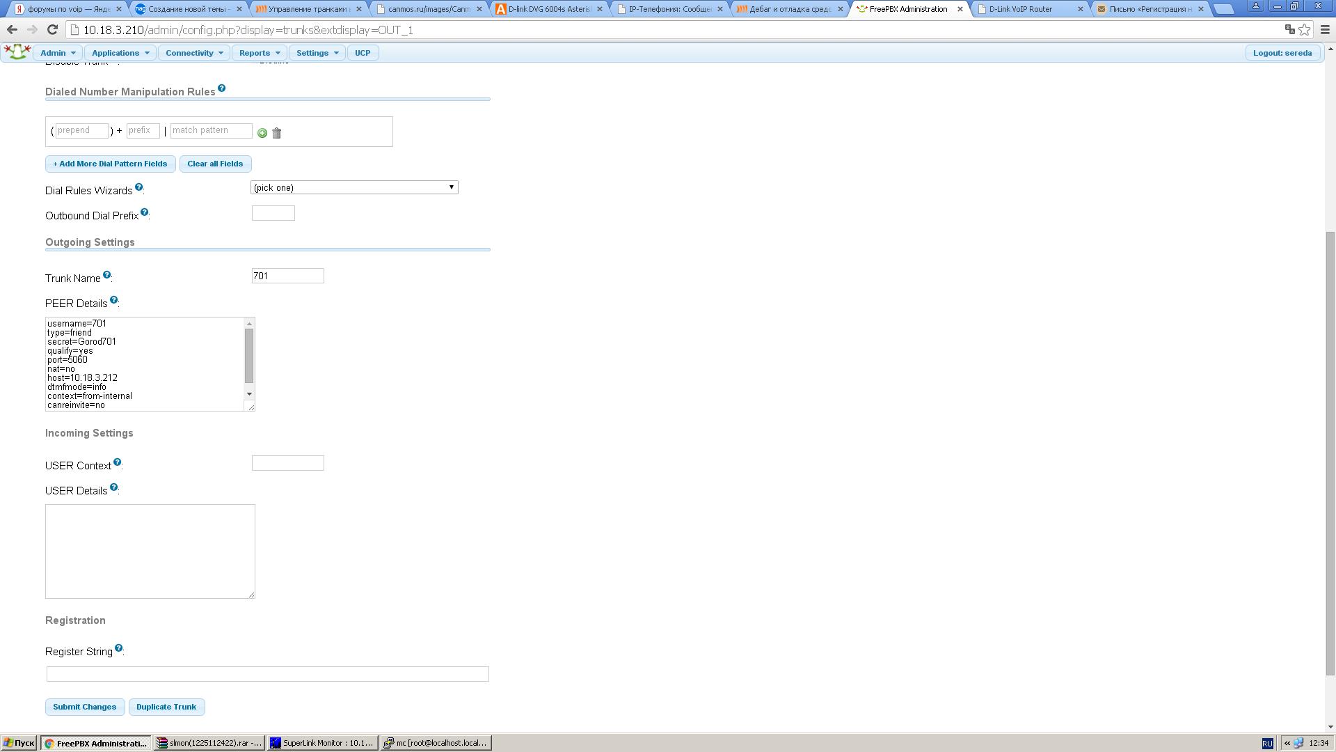 soultaker112 Posted November 19, 2015 Настроил Trunk для шлюза и шлюз соответственно, исходящие вызовы в город идут нормально а входящие не попадают на Freepbx. В примерах настройки в интернете пишут что достаточно создать правило входящей маршрутизации с DID номером который соответствует HotLine шлюза, пробывал ничего не выходит при звонке на шлюз короткие гудки(лог шлюза во вложении). Покопался в настройках Транка, в них есть поле входящих звонков и строка регистрации. Подскажите как в ней зарегистрировать шлюз что бы он смог перенаправить входящий из города Share this post Link to post Share on other sites More sharing options...
