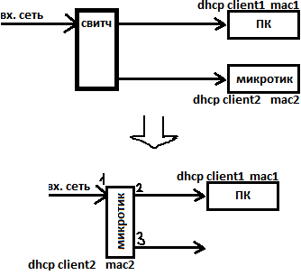 light59r Posted November 20, 2015 Posted November 20, 2015 Подскажите по возможностям бриджа на 951ui Сейчас работает так: Входящая сеть от провайдера, езернет шнур (разрешено 2 устройства, dhcp клиенты, если более и другой мак то выключается порт) все это подключено в свитч, который дальше соединен с ПК и с Микротиком (951ui раздает по wifi). Основное требование чтобы ПК не был за роутером и получал напрямую адрес от dhcp сервера провайдера. Возможно ли избавиться в этой схеме от свитча, при этом чтобы не появились в сети новые маки? Как видится, сеть от провайдера в eth1 микротик, объеденить eth1 и eth2 бриджем, к eth2 подключить ПК (1 dhcp клиент к провайдеру). eth3 сделать слейвом к бриджу, и на него в микротике сделать 2 dhcp клиент., полученое с eth3 раздавать клиентам по wifi, которые будут за микротиком? Будет работать по вводным или бред? Вставить ник Quote