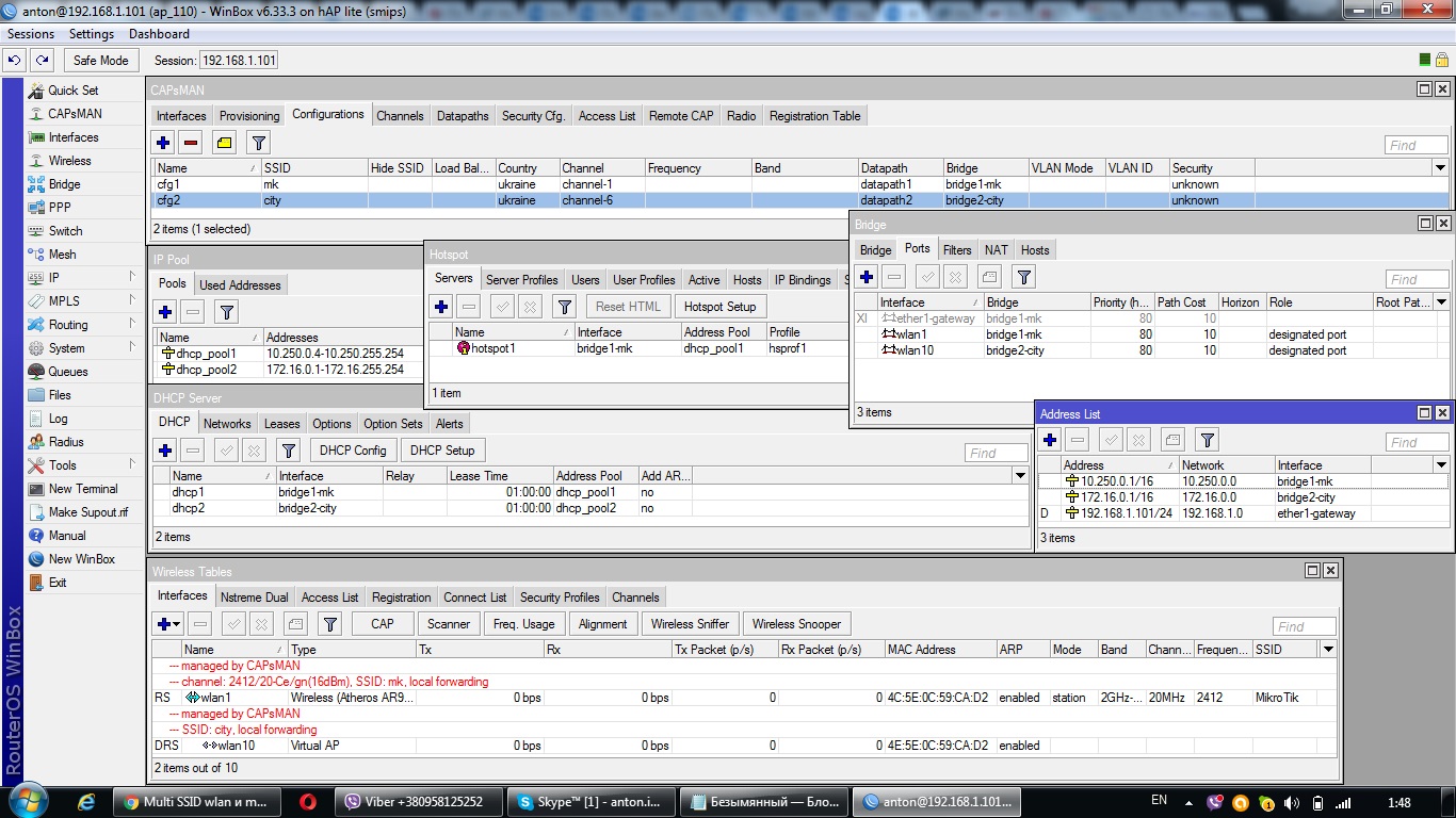 Tonchi Posted December 30, 2015 (edited) Дорогие форумчане, нужна Ваша помощь в реализации подобного функционала. Есть сервер (контролер) CAPsMAN точка 1 к нему подключены точки доступа CAP 2,3,4,5 (CAP подключаются по IP) На контролере CAPsMAN поднят hotspot и две Wi-Fi сети, одна из них виртуальная Wlan2 Нужно сделать, чтобы на Wlan1 имел один Хотспот, а на Wlan2 был другой Хотспот Можно разделить это бриджом? Bridge1 это Хотспот1, а Bridge2 это Хотспот2 В контролере CAPsMAN в колонке Configurations указать cfg-1 с Bridge1 а cfg-2 с Bridge2 Но как создать Bridge2 на один только Wlan1? второй WlanХХ создается автоматически CAPsMAN-ом и периодически номер меняется, в следствии чего, закрепить его в Bridge-2 нельзя. Что делать? P.S. С наступающим Новым Годом! :) Edited December 30, 2015 by Tonchi Share this post Link to post Share on other sites More sharing options...