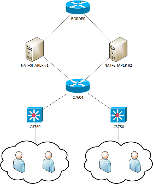crank Posted January 12, 2016 Posted January 12, 2016 (edited) Есть два каталиста 3750, которые терминируют абонентов (IP Unnumebred). В ядре сети стоит циска 7604. Поставлена задача разбалансировать трафик между двумя серверами, выполняющими функции НАТа и шейпера. Топология сети На форуме нашел (тык), что красиво решить данную задачу можно с помощью SLB. Раньше с этим не сталкивался. Подскажите как всё это правильно приготовить. Edited January 12, 2016 by crank Вставить ник Quote