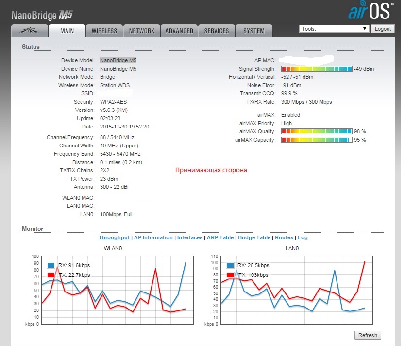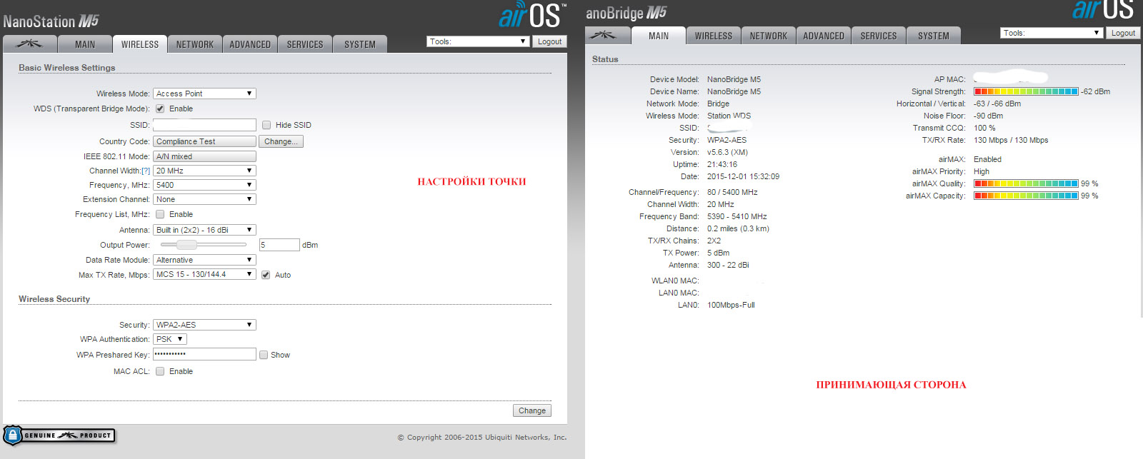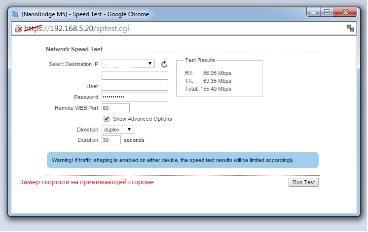 ramshik Posted February 1, 2016 Posted February 1, 2016 Всем доброго дня, товарищи помогите решить проблему не могу разобраться в чем дело. Итак есть модем ASUS RT-N66U заходит оптика 100 мегабит. От модема идет в NanoStation M5 по мосту пол километра, прямая видимость с крыши 5 этажки на трех этажное здание передает канал на NanoBridge M5. Прошивка 5.6.3 CT Суть проблемы на стороне приема замеряю скорость на ПК через патч-корд показывает 30 мегабит. На отдающей стороне подрубаю в марш ПК показывает 90 мегабит. До этого не чего не менялось не в настройке не в оборудовании на принимающей стороне показывало 90 мегабит потом что то случилось (МАГИЯ) и я получил 30 мегабит и. Пробовал играть с частотами с шириной и мощностью не больше 33-35 получилось. В тесте скорости дуплексом (между оборудованием) показывает нормальные правдивые значения (прикрепил скрин) Смотрел статью немного про другое но с доступным описанием параметров (http://www.technotrade.com.ua/Articles/ubiquiti_airlink_2012-06-15) Вроде у меня все нормально Что посоветуете !? Вставить ник Quote