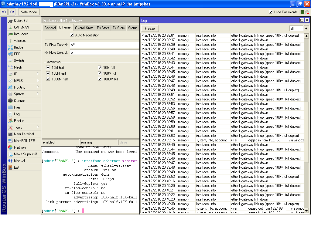 kosmich7 Posted March 13, 2016 Author Posted March 13, 2016 6.34.3 стало немного лучше, порт в 100ке чаще, но все равно иногда на 10M падает после ребутов, флапать порт перестал на сетевых картах. Буду дальше наблюдать. UPD: С Длинком проблема осталась. В 4й порт подключен мап 100Мбитный по даташиту. Простыня попыток скрестить девайсы. 325 Jan 1 00:09:37:LinkStatus-6:Port 4 link up, 100Mbps FULL duplex 324 Jan 1 00:09:35:LinkStatus-6:port 4 link down 323 Jan 1 00:09:35:LinkStatus-6:Port 4 link up, 1Gbps HALF duplex 322 Jan 1 00:09:33:LinkStatus-6:port 4 link down 321 Jan 1 00:09:33:LinkStatus-6:Port 4 link up, 100Mbps FULL duplex 320 Jan 1 00:09:31:LinkStatus-6:port 4 link down 319 Jan 1 00:09:31:LinkStatus-6:Port 4 link up, 100Mbps FULL duplex 318 Jan 1 00:09:29:LinkStatus-6:port 4 link down 317 Jan 1 00:09:29:LinkStatus-6:L 316 Jan 1 00:09:27:LinkStatus-6:port 4 link down K315 Jan 1 00:09:27:LinkStatus-6:Port 4 link up, 1Gbps HALF duplex 314 Jan 1 00:09:23:LinkStatus-6:port 4 link down 313 Jan 1 00:09:23:LinkStatus-6:Port 4 link up, 1Gbps HALF duplex 312 Jan 1 00:09:21:LinkStatus-6:port 4 link down 311 Jan 1 00:09:21:LinkStatus-6:Port 4 link up, 100Mbps FULL duplex 310 Jan 1 00:09:19:LinkStatus-6:port 4 link down 309 Jan 1 00:08:26:LinkStatus-6:Port 4 link up, 100Mbps HALF duplex 308 Jan 1 00:08:24:LinkStatus-6:port 4 link down 307 Jan 1 00:07:58:LinkStatus-6:Port 4 link up, 100Mbps HALF duplex 306 Jan 1 00:07:55:LinkStatus-6:port 4 link down 305 Jan 1 00:07:14:LinkStatus-6:Port 4 link up, 100Mbps HALF duplex 304 Jan 1 00:07:12:LinkStatus-6:port 4 link down 303 Jan 1 00:07:04:LinkStatus-6:Port 4 link up, 100Mbps HALF duplex 302 Jan 1 00:07:01:LinkStatus-6:port 4 link down 301 Jan 1 00:06:52:LinkStatus-6:Port 4 link up, 100Mbps HALF duplex 300 Jan 1 00:06:49:LinkStatus-6:port 4 link down 299 Jan 1 00:06:27:LinkStatus-6:Port 4 link up, 100Mbps HALF duplex 298 Jan 1 00:06:25:LinkStatus-6:port 4 link down 297 Jan 1 00:05:14:LinkStatus-6:Port 4 link up, 10Mbps FULL duplex 296 Jan 1 00:05:12:LinkStatus-6:port 4 link down 295 Jan 1 00:05:12:LinkStatus-6:Port 4 link up, 1Gbps HALF duplex 294 Jan 1 00:05:10:LinkStatus-6:port 4 link down 293 Jan 1 00:05:10:LinkStatus-6:Port 4 link up, 1Gbps HALF duplex 292 Jan 1 00:05:08:LinkStatus-6:port 4 link down 291 Jan 1 00:05:08:LinkStatus-6:Port 4 link up, 100Mbps FULL duplex 290 Jan 1 00:05:06:LinkStatus-6:port 4 link down 289 Jan 1 00:05:06:LinkStatus-6:Port 4 link up, 100Mbps FULL duplex 288 Jan 1 00:05:04:LinkStatus-6:port 4 link down 287 Jan 1 00:05:04:LinkStatus-6:Port 4 link up, 1Gbps HALF duplex 286 Jan 1 00:05:01:LinkStatus-6:port 4 link down 285 Jan 1 00:05:01:LinkStatus-6:Port 4 link up, 1Gbps HALF duplex 284 Jan 1 00:04:59:LinkStatus-6:port 4 link down 283 Jan 1 00:04:59:LinkStatus-6:Port 4 link up, 1Gbps HALF duplex 282 Jan 1 00:04:57:LinkStatus-6:port 4 link down 281 Jan 1 00:04:57:LinkStatus-6:Port 4 link up, 1Gbps HALF duplex 280 Jan 1 00:04:55:LinkStatus-6:port 4 link down 279 Jan 1 00:04:55:LinkStatus-6:Port 4 link up, 1Gbps HALF duplex 278 Jan 1 00:04:53:LinkStatus-6:port 4 link down 277 Jan 1 00:04:52:LinkStatus-6:Port 4 link up, 100Mbps HALF duplex 276 Jan 1 00:04:51:LinkStatus-6:port 4 link down 275 Jan 1 00:04:50:LinkStatus-6:Port 4 link up, 100Mbps HALF duplex K274 Jan 1 00:04:49:LinkStatus-6:port 4 link downa ALL 273 Jan 1 00:04:48:LinkStatus-6:Port 4 link up, 100Mbps HALF duplex 272 Jan 1 00:04:47:LinkStatus-6:port 4 link down 271 Jan 1 00:04:46:LinkStatus-6:Port 4 link up, 1Gbps HALF duplex 270 Jan 1 00:04:45:LinkStatus-6:port 4 link down 269 Jan 1 00:04:44:LinkStatus-6:Port 4 link up, 100Mbps HALF duplex 268 Jan 1 00:04:43:LinkStatus-6:port 4 link down 267 Jan 1 00:04:42:LinkStatus-6:Port 4 link up, 1Gbps HALF duplex 266 Jan 1 00:04:41:LinkStatus-6:port 4 link down 265 Jan 1 00:04:40:LinkStatus-6:Port 4 link up, 1Gbps HALF duplex 264 Jan 1 00:04:39:LinkStatus-6:port 4 link down 263 Jan 1 00:04:38:LinkStatus-6:Port 4 link up, 1Gbps HALF duplex 262 Jan 1 00:04:37:LinkStatus-6:port 4 link down 261 Jan 1 00:04:36:LinkStatus-6:Port 4 link up, 100Mbps HALF duplex 260 Jan 1 00:04:35:LinkStatus-6:port 4 link down 259 Jan 1 00:04:34:LinkStatus-6:Port 4 link up, 1Gbps HALF duplex 258 Jan 1 00:04:32:LinkStatus-6:port 4 link down 257 Jan 1 00:04:32:LinkStatus-6:Port 4 link up, 100Mbps HALF duplex 256 Jan 1 00:04:29:LinkStatus-6:port 4 link down 255 Jan 1 00:04:28:LinkStatus-6:Port 4 link up, 100Mbps FULL duplex 254 Jan 1 00:04:26:LinkStatus-6:port 4 link down 253 Jan 1 00:04:26:LinkStatus-6:Port 4 link up, 1Gbps HALF duplex 252 Jan 1 00:04:24:LinkStatus-6:port 4 link down 251 Jan 1 00:04:24:LinkStatus-6:Port 4 link up, 1Gbps HALF duplex 250 Jan 1 00:04:22:LinkStatus-6:port 4 link down 249 Jan 1 00:04:22:LinkStatus-6:Port 4 link up, 100Mbps FULL duplex 248 Jan 1 00:04:20:LinkStatus-6:port 4 link down 247 Jan 1 00:04:20:LinkStatus-6:Port 4 link up, 1Gbps HALF duplex 246 Jan 1 00:04:18:LinkStatus-6:port 4 link down 245 Jan 1 00:04:18:LinkStatus-6:Port 4 link up, 1Gbps HALF duplex 244 Jan 1 00:04:16:LinkStatus-6:port 4 link down 243 Jan 1 00:04:16:LinkStatus-6:Port 4 link up, 1Gbps HALF duplex 242 Jan 1 00:04:14:LinkStatus-6:port 4 link down 241 Jan 1 00:04:14:LinkStatus-6:Port 4 link up, 1Gbps HALF duplex 240 Jan 1 00:04:12:LinkStatus-6:port 4 link down 239 Jan 1 00:04:12:LinkStatus-6:Port 4 link up, 1Gbps HALF duplex 238 Jan 1 00:04:10:LinkStatus-6:port 4 link down 237 Jan 1 00:04:10:LinkStatus-6:Port 4 link up, 1Gbps HALF duplex 236 Jan 1 00:04:08:LinkStatus-6:port 4 link down 235 Jan 1 00:04:08:LinkStatus-6:Port 4 link up, 1Gbps HALF duplex 234 Jan 1 00:04:06:LinkStatus-6:port 4 link down K233 Jan 1 00:04:06:LinkStatus-6:Port 4 link up, 1Gbps HALF duplex 232 Jan 1 00:04:04:LinkStatus-6:port 4 link down 231 Jan 1 00:04:04:LinkStatus-6:P