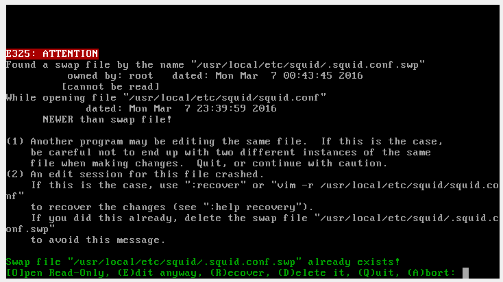 SHAH0009 Posted March 7, 2016 Posted March 7, 2016 Доброго времени суток! Недавно начал изучать FreeBSD. Скачал vim. Открывал с его помощью файлы и все было хорошо. Потом открыл squid с помощью vim и увидел следующее сообщение (картинка). Искал что оно значит но не нашел, подскажите пожалуйста что оно значит. Такой интерес оно вызвало из за мыслей о том нет ли какой-либо ошибки. Если кто то значит что оно значит пожалуйста подскажите! Заранее благодарен! :) Вставить ник Quote