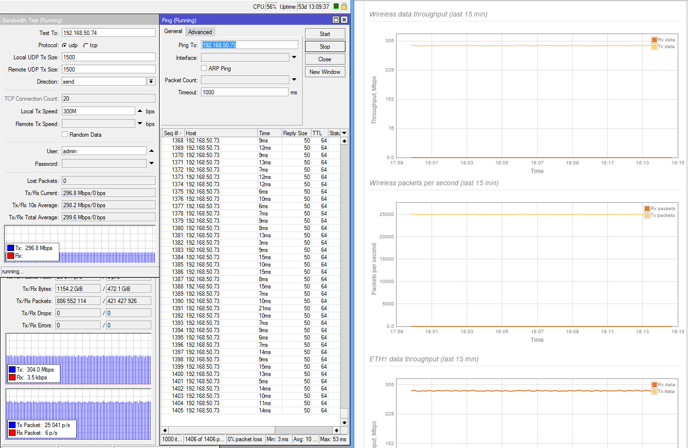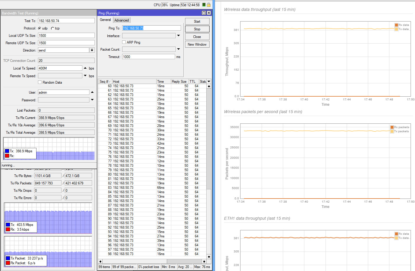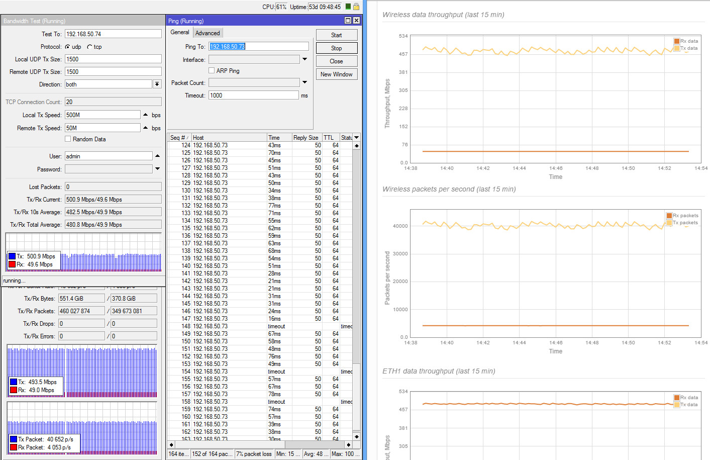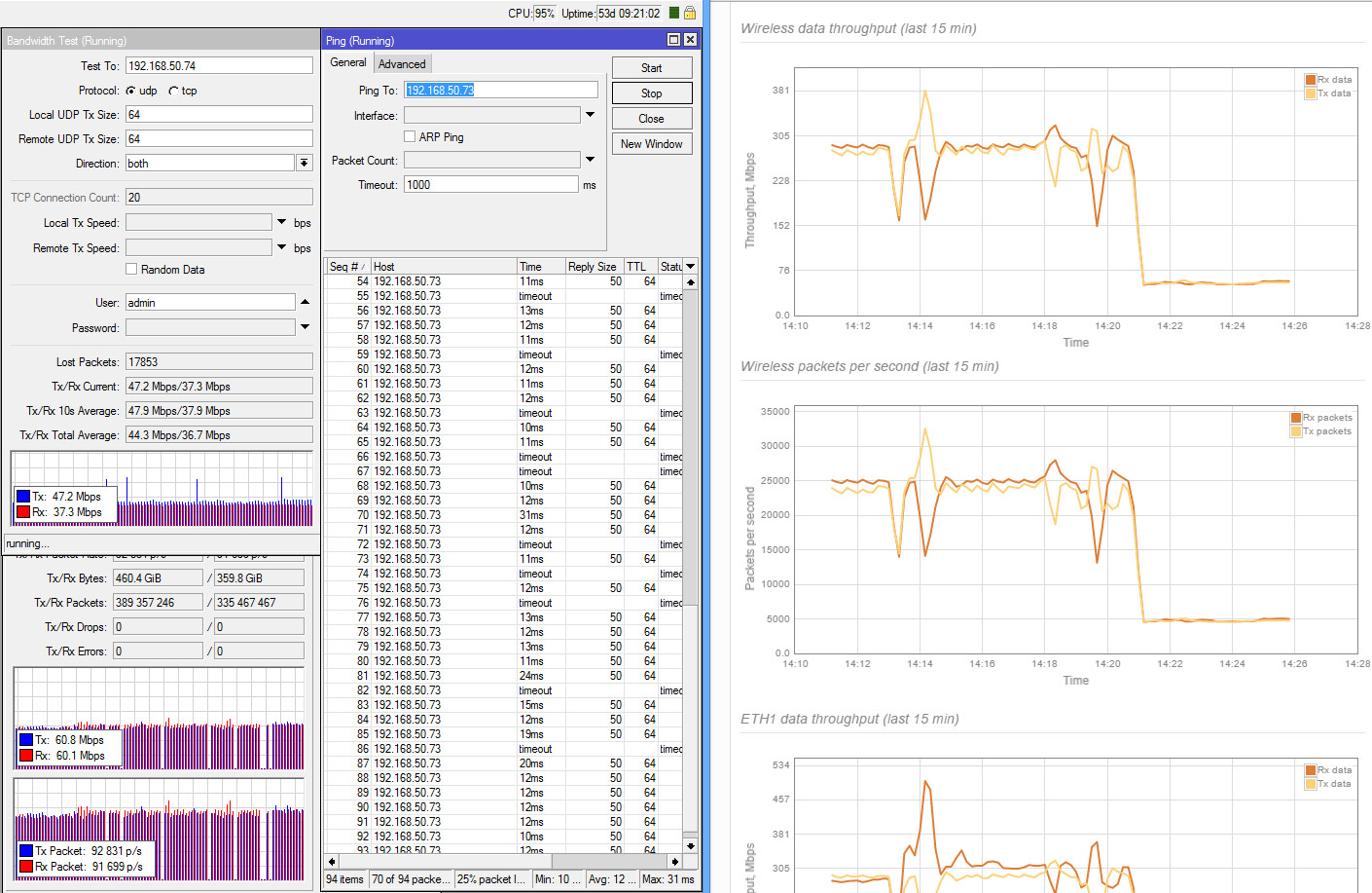 xabarov Posted March 13, 2016 Author Posted March 13, 2016 UDP тесты RapidFire 5-N с полосой 80 МГц: Duplex UDP с ограничением 200М в обе стороны (200+200 мбит) - средняя задержка 17 мс, без потерь Duplex UDP с ограничением 260М в обе стороны (260+260 мбит) - средняя задержка 40 мс, потери 1% Duplex UDP с ограничением 300М в обе стороны (300+300 мбит) - средняя задержка 66 мс, потери 3% Без ограничений получается чуть больше 300, но начинается сильная деградация и потери более 20%. Duplex UDP с ограничением 450/50 (суммарно 500 мбит) - средняя задержка 30 мс, потери 1% Duplex UDP с ограничением 500/50 (суммарно 550 мбит) - средняя задержка 48 мс, потери 7% Дуплексный тест пакетной производительности по 64 байта - 90+90 (суммарно 180 тыс.). Это по данным микротика, на грифике Лиго почему-то всего 5+5, хотя в предыдущих тестах видны более высокие цифры (40-50 тыс.). Задал вопрос производителю, жду ответ. Simplex UDP с ограничением 300М - средняя задержка 10 мс, без потерь Simplex UDP с ограничением 400М - средняя задержка 20 мс, без потерь Simplex UDP с ограничением 500М - средняя задержка 22 мс, потери 1% Simplex UDP без ограничений - средняя задержка 50 мс, потери 18%, максимальная пропускная способность около 600 мбит Во время тестов на максимальных скоростях (более 400 мбит) заметны кратковременные провалы на 10-20% каждые 30 секунд (видно на графиках). Пока не удалось определить причину возникновения (изучаем).