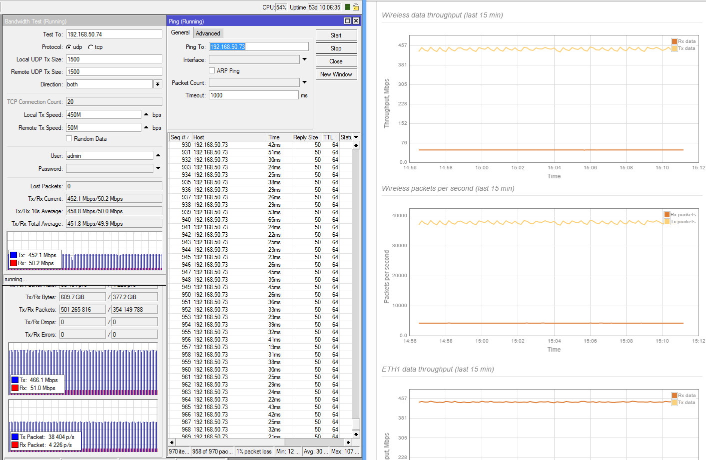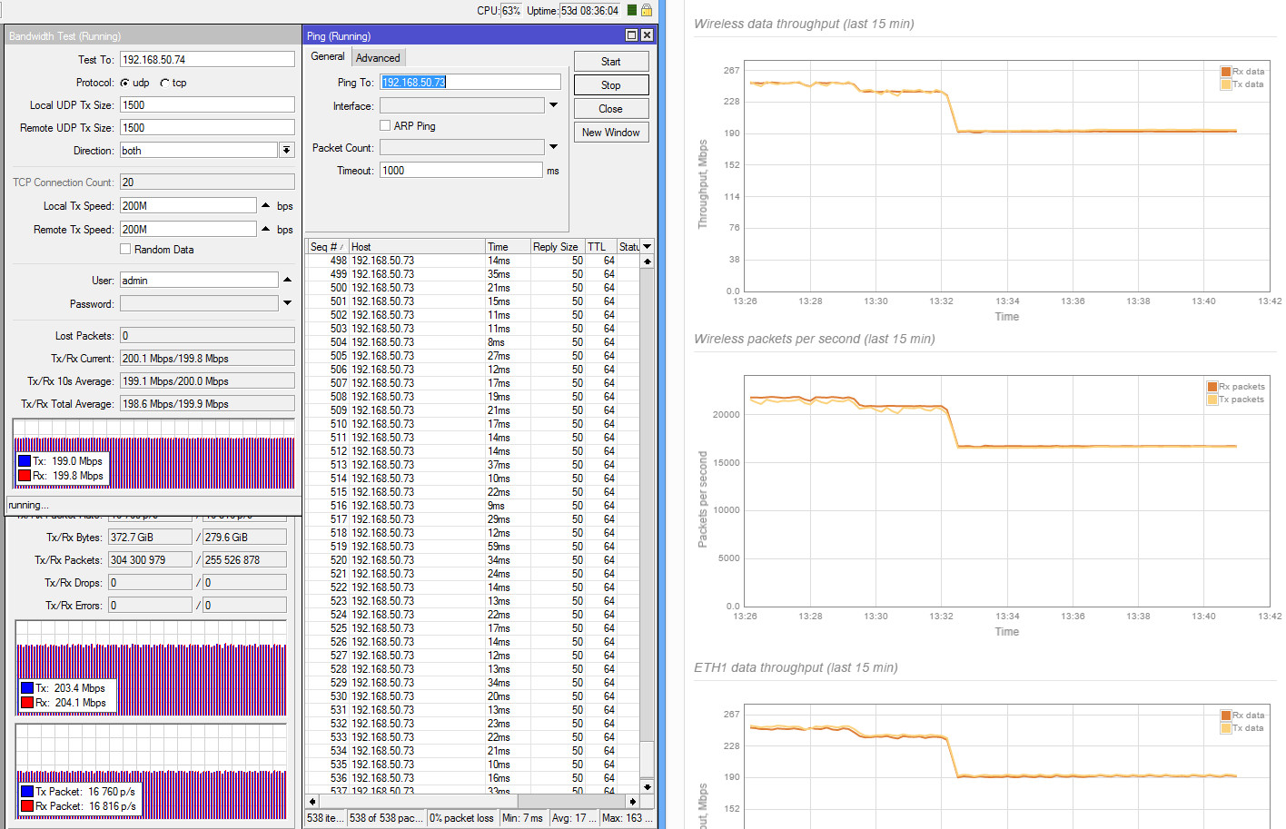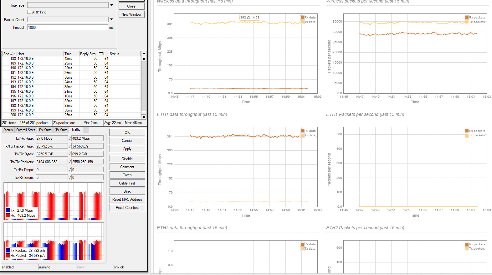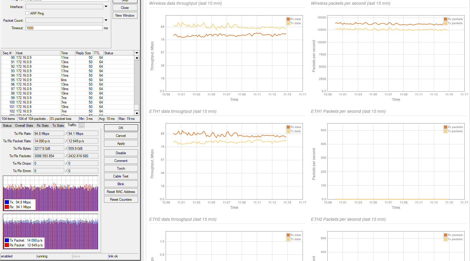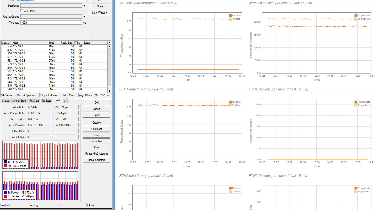 xabarov Posted March 13, 2016 Posted March 13, 2016 ВНИМАНИЕ! ТЕМА НЕ ДЛЯ СПОРОВ "ЧТО ЛУЧШЕ/ХУЖЕ/ДЕШЕВЛЕ/ДОРОЖЕ/ТЕХНОЛОГИЧНЕЕ и т.п., здесь будет только размещение результатов и рекомендации по возможным настройкам/тестам. Весь оффтоп буду удалять. Как и обещал, начинаю выкладывать результаты тестов LigoPTP RapidFire 5-N (версия без интегрированной антенны). Ссылка на железку на сайте производителя. Пока только удалось прогнать UDP-тесты, т.к на одной из сторон используется CCR1009, у которого во время TCP теста загрузка одного ядра упирается в 100% (обновление прошивки до последней версии не помогло), а на всех ядрах запустить не получается. К сожалению, не успеваю разобраться с настройками iperf, но это вопрос ближайшего времени. Исходные данные - расстояние 24 км, зона Френеля частично перекрыта, линк из центра крупного города с зашумленным эфиром в сторону области. Уровень помех от -60 до -80. Выбран наиболее свободный участок диапазона 5 ГГц. Антенны RocketDish 5G31