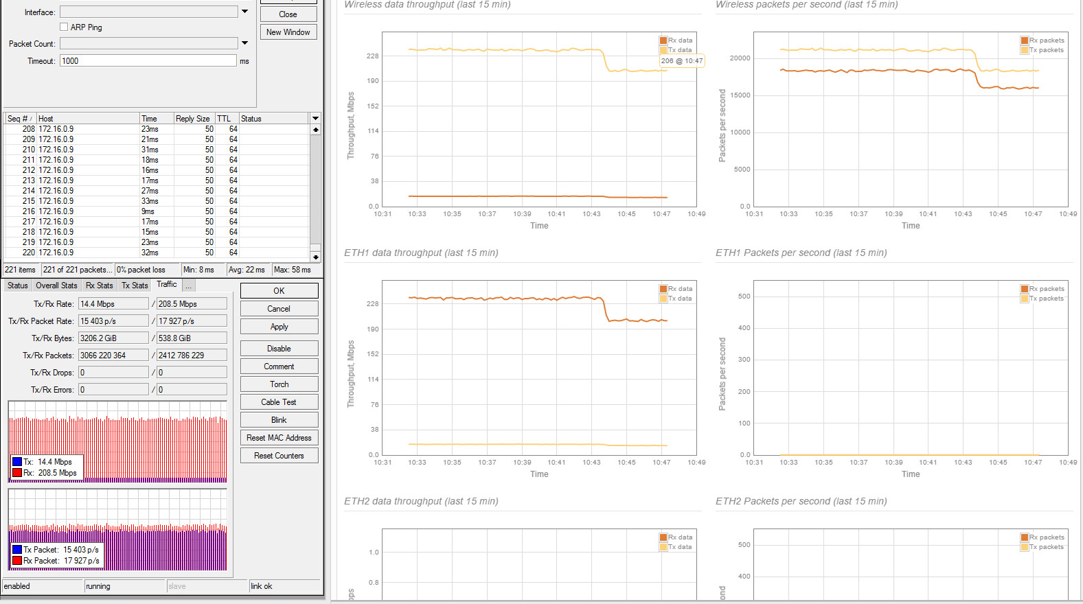 slv700 Posted July 19, 2016 Posted July 19, 2016 Duplex TCP полноценно прогнать не удалось - iperf не работает с большим количеством потоков в дуплексе, суммарно удалось получить около 180 мбит с средней задержкой 10 мс без потерь. Iperf TCP дуплекс -глючный во в многих своих версиях. Для дуплекса надо запускать два TCP симплекса в противоположные стороны. Но если это не работает, то проблема не в iperf. Попробуйте дать ассиметричный дуплекс и понять какой встречный трафик начинает заваливать канал.