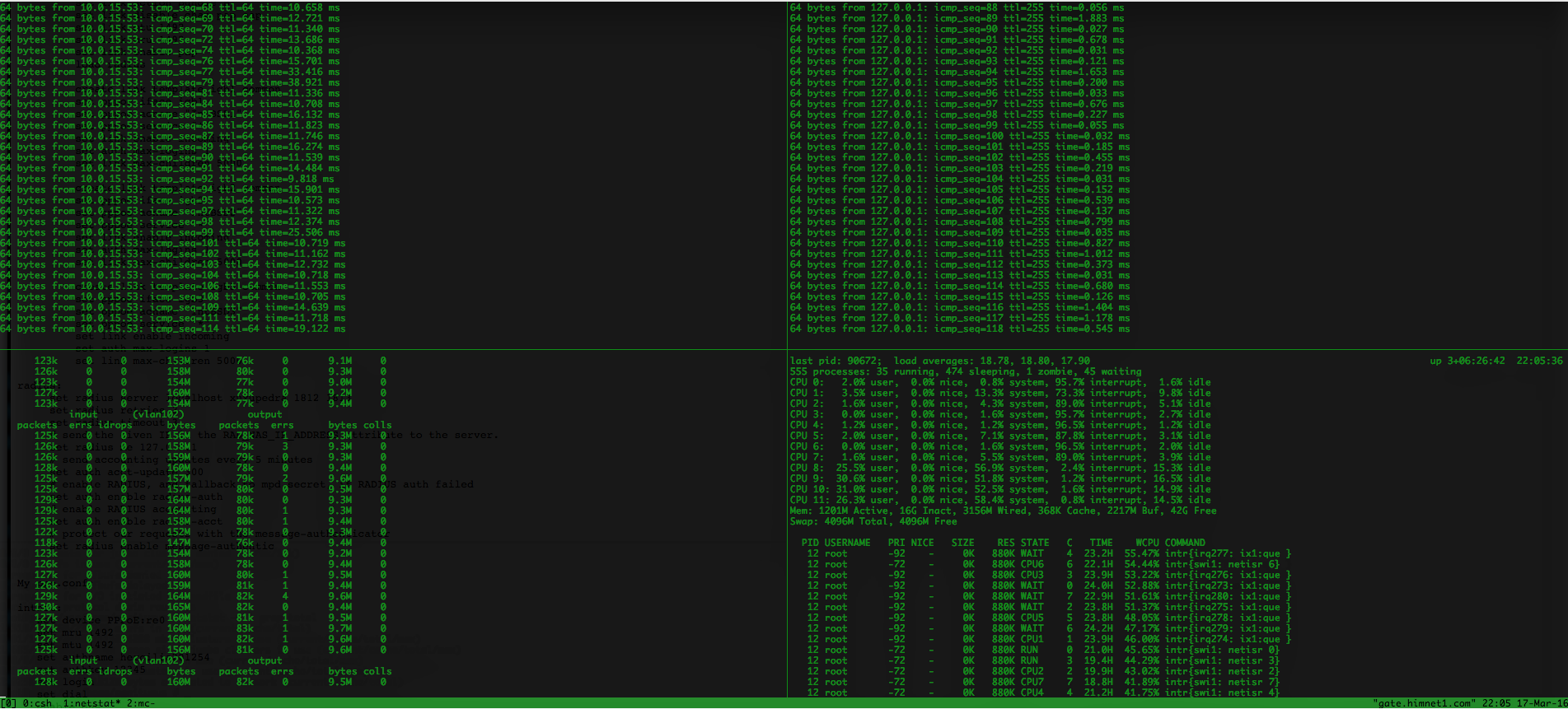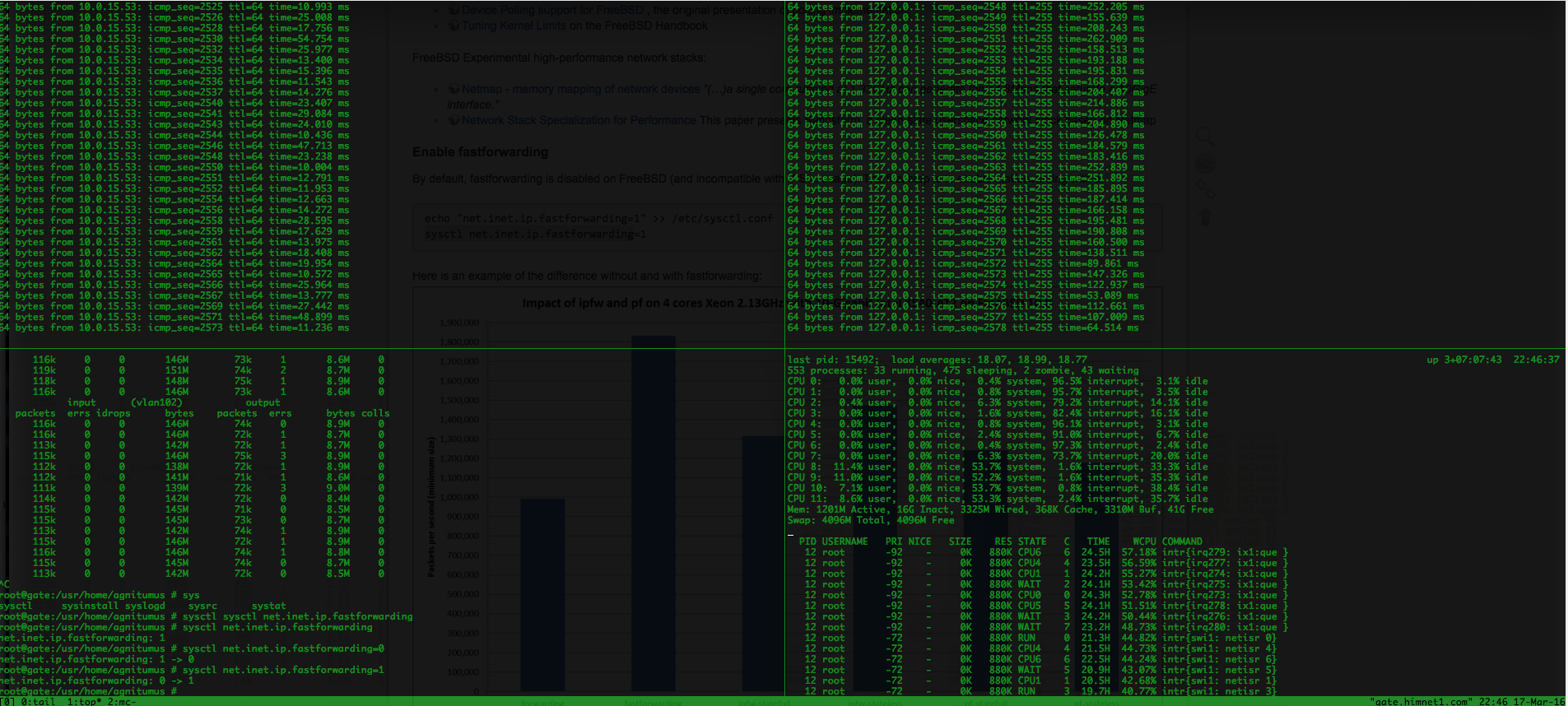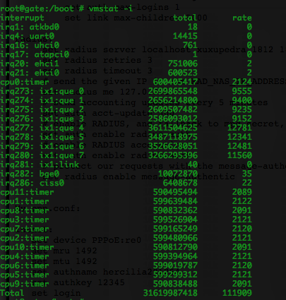 agnitumus Posted March 17, 2016 Posted March 17, 2016 (edited) Имеем боевая машина ProLiant DL380p Gen8 2xIntel® Xeon® CPU E5-2620 v2 @ 2.10GHz FreeBSD + MPD + Radius -> L2TP/IPSEC LAC (280 vlans/1020 Tunnels) = 3500+ Сессий (1.6G) трафика Даже и не знаю куда копать ... Была похожая ситуация и Решил проблему отключением HyperTrading. А тут уже никак Сеточки 03:00.0 Ethernet controller: Broadcom Corporation NetXtreme BCM5719 Gigabit Ethernet PCIe (rev 01) 03:00.1 Ethernet controller: Broadcom Corporation NetXtreme BCM5719 Gigabit Ethernet PCIe (rev 01) 03:00.2 Ethernet controller: Broadcom Corporation NetXtreme BCM5719 Gigabit Ethernet PCIe (rev 01) 03:00.3 Ethernet controller: Broadcom Corporation NetXtreme BCM5719 Gigabit Ethernet PCIe (rev 01) 07:00.0 Ethernet controller: Intel Corporation 82599ES 10-Gigabit SFI/SFP+ Network Connection (rev 01) 07:00.1 Ethernet controller: Intel Corporation 82599ES 10-Gigabit SFI/SFP+ Network Connection (rev 01) <-- ix1 только через него трафик ifconfig ix1 ix1: flags=8843<UP,BROADCAST,RUNNING,SIMPLEX,MULTICAST> metric 0 mtu 1500 options=407bb<RXCSUM,TXCSUM,VLAN_MTU,VLAN_HWTAGGING,JUMBO_MTU,VLAN_HWCSUM,TSO4,TSO6,LRO,VLAN_HWTSO> ether 90:e2:ba:97:ab:21 inet 10.0.0.1 netmask 0xffff0000 broadcast 10.0.255.255 inet 10.1.0.1 netmask 0xffff0000 broadcast 10.1.255.255 media: Ethernet autoselect (10Gbase-SR <full-duplex>) status: active Спустя минут 20 Edited March 17, 2016 by agnitumus Вставить ник Quote