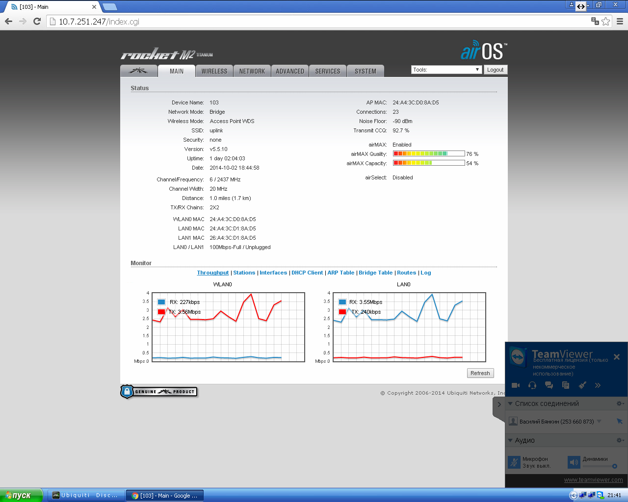 vas--ka Posted March 19, 2016 Posted March 19, 2016 Добрый день форумчане! Случилась странная (для меня) ситуация. Доблестные электрики отрубили свет, а после того как врубили у клиентов упали CCQ. Шума не прибавилось, частоты на базах заданы руками (не auto), перезагрузка баз не помогла, смена частот тоже. Инет как бы есть но только номинально. 1БС 2.4 ГГц - два сектора 90гр, 2 NanoBeam (один на мост), тарифы 3 Мбита, 2БС 2.4 ГГц сектор и Omni связанная с первой мостом из nanoBeam. Расстояние м/у БС 1.8 км. Есть у кого какие соображения. Заранее благодарю за конструктивные советы. Пересесть на 5 ГГц и оптику не из них. Вставить ник Quote
