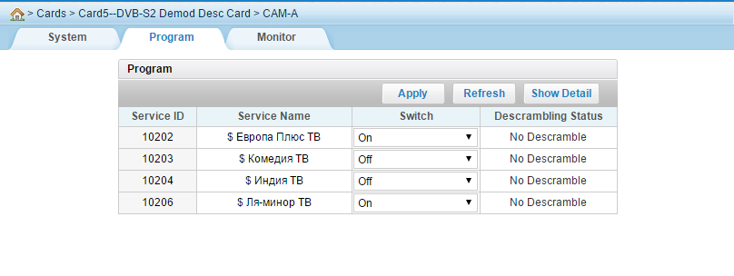 Zuhell Posted March 19, 2016 Posted March 19, 2016 Есть карта C525CI у которой периодически появляются проблемы с дескремблированием. CAM-модули вставлялись разные: Aston Viaccess, Smit Conax, Powercam 5.2 В одни прекрасный момент перестают работать модули или один из двух: DVB-S2 Demod Desc Card 5 CAM Card B Unlock DVB-S2 Demod Desc Card 5 CAM Card B CASID Dismatch DVB-S2 Demod Desc Card 5 CAM Card A CASID Dismatch Смена параметров, вытаскивание модулей не помогает. Только перезагрузка ГС. Проблемная - card5, в ГС установлена аналогичная card6, таких проблем с ней не возникает. card5--DVB-S2 Demod Desc Card Hardware: V1.1 FPGA1: V3.0.1.7 Co-Sys: Boot:1.0.0/Kernel:1.0.1 SN: 1406C525CI0057 Software: V3.0.4.10 Demod: V2.0.1 Co-App: App:1.2.2/CI:2.1.3 card6--DVB-S2 Demod Desc Card Hardware: V1.1 FPGA1: V3.0.1.7 Co-Sys: Boot:1.0.0/Kernel:1.0.1 SN: 1406C525CI0058 Software: V3.0.4.10 Demod: V2.0.1 Co-App: App:1.2.2/CI:2.1.3 Настройки прилагаю. Смущает Descrambling Status, который всегда в одном положение - No Descramble. Прошу помощи. Вставить ник Quote