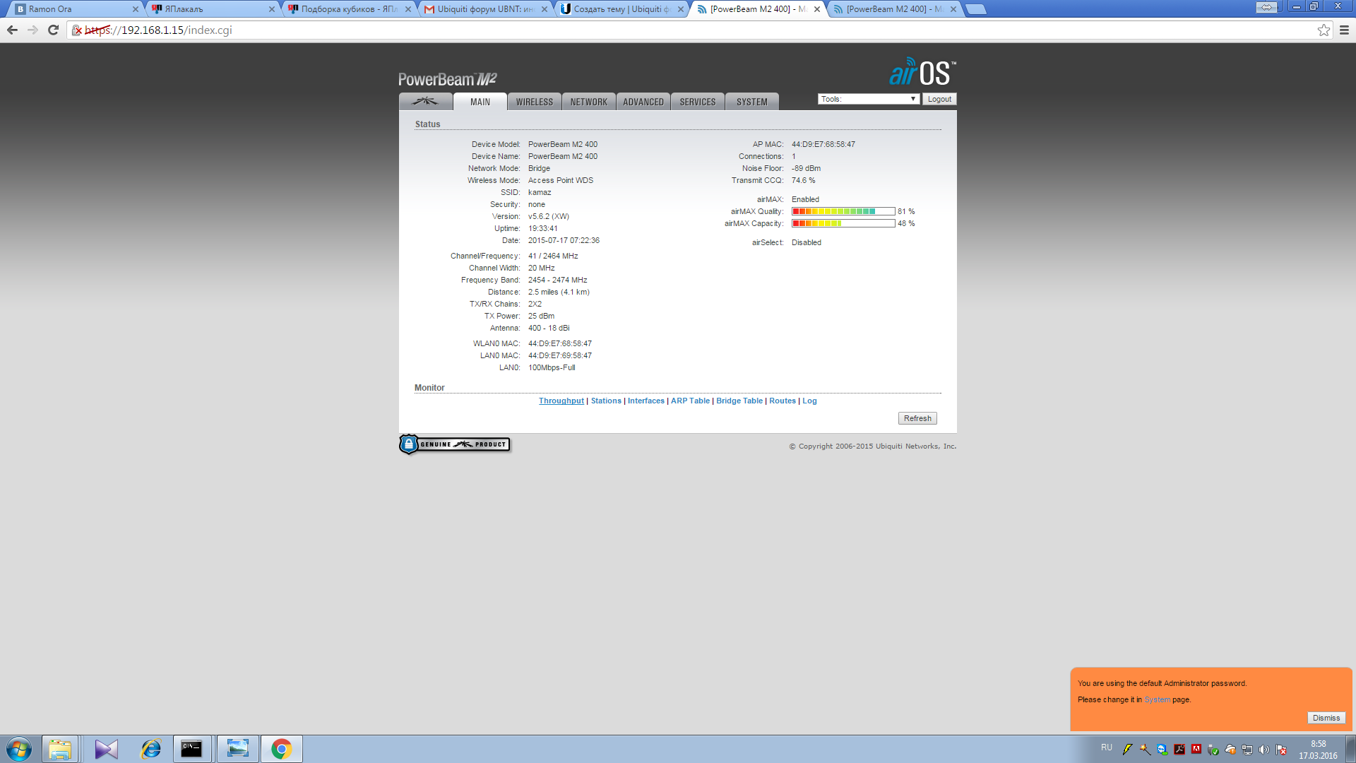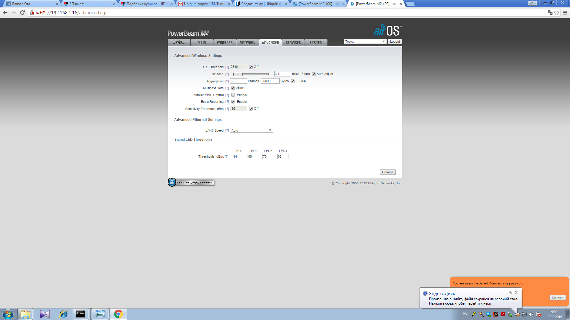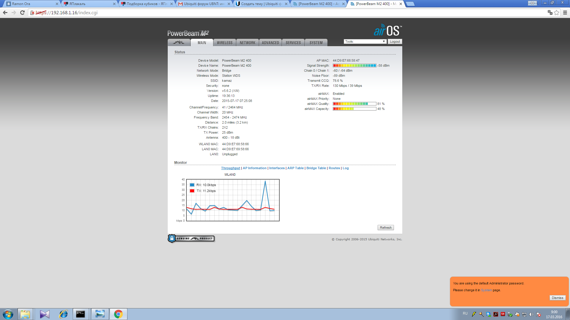 stefbarinov Posted April 1, 2016 Posted April 1, 2016 (edited) Приветствую уважаемых пользователей данного форума. У меня возникла проблема, рад любой помощи. Приобрели PowerBeam PBE-M2-400 взамен Nanostation M5. На M5 все работало без нареканий. После замены на PowerBeam m2 уровень сигнала стал лучше. Пинги проходят, работают все нужные программы(удаленный рабочий стол, 1с, интернет), но при попытке передачи файла(любого размера начиная от 300кб) с удаленного объекта связь пропадает минут на 5-10. Обе антенны в этот момент продолжают пинговаться, но доступ на удаленную антену пропадает. То же самое происходит при попытке пройти любой speedtest(как штатный на антеннах, так и сторонний). Настройки прикладываю скринами. Готов дать любую дополнительную информацию. Заранее спасибо за любую помощь. Отключи мультикаст, если не используешь! Почему модуляция 32/20000? Пробуй уходить на частоты в 2,3Ггц, там тихо (2357-2367). И про шифрование не забываем) Edited April 1, 2016 by stefbarinov Вставить ник Quote