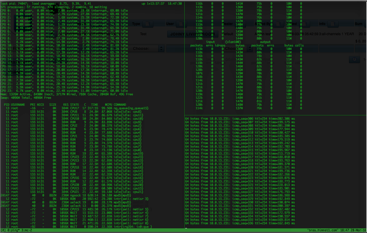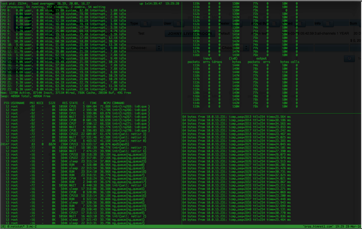 agnitumus Posted March 28, 2016 Posted March 28, 2016 (edited) Доброго времени суток ! Есть боевой сервер MPD5 (shaper) + RAdius + L2TP(3500+ Online) При непонятных обстоятельствах начинает подыматься пинг на выданные ип адреса... Подскажите, как понять кто грузит ! Шейпит NG_CAR/NG_BPF (MPD5) ipfw ${FwCMD} -f flush ${FwCMD} -f pipe flush ${FwCMD} -f queue flush ${FwCMD} add check-state ${FwCMD} add allow ip from any to any via lo0 ${FwCMD} add deny ip from any to 127.0.0.0/8 ${FwCMD} add deny ip from 127.0.0.0/8 to any ${FwCMD} add deny icmp from any to any in icmptype 5,9,13,14,15,16,17 ${FwCMD} add allow all from me to any ${FwCMD} add setfib 1 ip from 10.0.0.0/20 to any. ${FwCMD} add setfib 1 ip from any to 10.0.0.0/20.. ${FwCMD} add setfib 1 ip from 10.0.16.0/22 to any ${FwCMD} add setfib 1 ip from any to 10.0.16.0/22. ${FwCMD} add setfib 1 ip from 10.0.20.0/24 to any ${FwCMD} add setfib 1 ip from any to 10.0.20.0/24. ${FwCMD} add deny all from 10.0.0.0/22 to ${NotLocal} 25 ${FwCMD} add deny ip from any to 192.168.0.0/16 in via ${LanOut_i} ${FwCMD} add deny ip from any to 0.0.0.0/8 in via ${LanOut_i} ... Сетевухи 07:00.0 Ethernet controller: Intel Corporation 82599ES 10-Gigabit SFI/SFP+ Network Connection (rev 01) <-- ix0 Internet 07:00.1 Ethernet controller: Intel Corporation 82599ES 10-Gigabit SFI/SFP+ Network Connection (rev 01) <-- ix1 через неё L2TP Нат на отдельной машине Картинки Вкучу netstat -m vmstat -i vmstat -z ITEM SIZE LIMIT USED FREE REQ FAIL SLEEP UMA Kegs: 208, 0, 112, 7, 113, 0, 0 UMA Zones: 3456, 0, 112, 0, 113, 0, 0 UMA Slabs: 568, 0, 74660, 16,16457409, 0, 0 UMA RCntSlabs: 568, 0, 65314, 3, 65314, 0, 0 UMA Hash: 256, 0, 0, 15, 4, 0, 0 16 Bucket: 152, 0, 260, 15, 260, 0, 0 32 Bucket: 280, 0, 590, 12, 593, 1, 0 64 Bucket: 536, 0, 1237, 2, 1269, 86, 0 128 Bucket: 1048, 0, 9877, 2, 10316,17576, 0 VM OBJECT: 232, 0, 188446, 6674,187832986, 0, 0 MAP: 240, 0, 8, 24, 8, 0, 0 KMAP ENTRY: 128, 6257185, 1392, 4437,43966762, 0, 0 MAP ENTRY: 128, 0, 4333, 62077,764088175, 0, 0 fakepg: 120, 0, 0, 0, 0, 0, 0 mt_zone: 4112, 0, 304, 7, 304, 0, 0 16: 16, 0, 9022, 4082,125058830, 0, 0 32: 32, 0, 22791, 25790,34632566360, 0, 0 64: 64, 0, 18801, 30031,311417003, 0, 0 128: 128, 0, 185173, 276536,40772887, 0, 0 256: 256, 0, 49960, 10070,120999905, 0, 0 512: 512, 0, 15064, 19327, 4000960, 0, 0 1024: 1024, 0, 100, 1948,16708911, 0, 0 2048: 2048, 0, 5010, 2466, 1258735, 0, 0 4096: 4096, 0, 7341, 2901, 4228575, 0, 0 Files: 80, 0, 3300, 4620,260845765, 0, 0 TURNSTILE: 136, 0, 5053, 487, 5053, 0, 0 rl_entry: 40, 0, 1321, 1031, 1321, 0, 0 umtx pi: 96, 0, 0, 0, 0, 0, 0 MAC labels: 40, 0, 0, 0, 0, 0, 0 PROC: 1192, 0, 83, 1258, 2578305, 0, 0 THREAD: 1160, 0, 1837, 3215, 936590, 0, 0 SLEEPQUEUE: 80, 0, 5053, 602, 5053, 0, 0 VMSPACE: 400, 0, 63, 2151, 2578209, 0, 0 cpuset: 72, 0, 176, 1124, 256, 0, 0 audit_record: 960, 0, 0, 0, 0, 0, 0 mbuf_packet: 256, 26023590, 1, 7423,432544103, 0, 0 mbuf: 256, 26023590, 34116, 42685,42672981055, 0, 0 mbuf_cluster: 2048, 400000, 7424, 710, 7424, 0, 0 mbuf_jumbo_page: 4096, 5824288, 0, 2360, 238143, 0, 0 mbuf_jumbo_9k: 9216, 602397, 33293, 25594,10140746194, 0, 0 mbuf_jumbo_16k: 16384, 338848, 0, 0, 0, 0, 0 mbuf_ext_refcnt: 4, 0, 0, 0, 0, 0, 0 NetGraph items: 72, 20480003, 39, 3586,8009516815, 0, 0 NetGraph data items: 72, 20480003, 7, 44421,18664026246, 0, 0 g_bio: 248, 0, 0, 11115,10241114, 0, 0 ttyinq: 160, 0, 315, 1077, 1305, 0, 0 ttyoutq: 256, 0, 167, 718, 689, 0, 0 ata_request: 320, 0, 0, 24, 1, 0, 0 ata_composite: 336, 0, 0, 0, 0, 0, 0 vtnet_tx_hdr: 24, 0, 0, 0, 0, 0, 0 VNODE: 504, 0, 422200, 2864, 1770452, 0, 0 VNODEPOLL: 112, 0, 0, 132, 4, 0, 0 S VFS Cache: 108, 0, 305330, 114133, 1705457, 0, 0 STS VFS Cache: 148, 0, 0, 0, 0, 0, 0 L VFS Cache: 328, 0, 58151, 8089, 138833, 0, 0 LTS VFS Cache: 368, 0, 0, 0, 0, 0, 0 NAMEI: 1024, 0, 1, 1019,437924699, 0, 0 NCLNODE: 568, 0, 0, 0, 0, 0, 0 DIRHASH: 1024, 0, 5407, 789, 5537, 0, 0 Mountpoints: 824, 0, 4, 16, 4, 0, 0 pipe: 728, 0, 7, 1168, 1027084, 0, 0 ksiginfo: 112, 0, 1330, 2960, 190654, 0, 0 itimer: 344, 0, 0, 22, 1, 0, 0 KNOTE: 128, 0, 49, 1836, 3022540, 0, 0 socket: 680, 4191264, 3831, 3609, 5263904, 0, 0 unpcb: 240, 4191264, 439, 2169, 3310964, 0, 0 ipq: 56, 12537, 0, 1701, 182, 0, 0 udp_inpcb: 392, 4191270, 1805, 3335, 1704417, 0, 0 udpcb: 16, 4191264, 1805, 4579, 1704417, 0, 0 tcp_inpcb: 392, 4191270, 19, 951, 54728, 0, 0 tcpcb: 976, 4191264, 19, 897, 54728, 0, 0 tcptw: 72, 2000000, 0, 1800, 2764, 0, 0 syncache: 152, 102400, 0, 1250, 39165, 0, 0 hostcache: 136, 15372, 12, 912, 129, 0, 0 sackhole: 32, 0, 0, 2727, 685, 0, 0 tcpreass: 40, 25032, 0, 3948, 6047, 0, 0 sctp_ep: 1376, 4191264, 0, 0, 0, 0, 0 sctp_asoc: 2288, 40000, 0, 0, 0, 0, 0 sctp_laddr: 48, 80064, 0, 2088, 1635, 0, 0 sctp_raddr: 696, 80000, 0, 0, 0, 0, 0 sctp_chunk: 136, 400008, 0, 0, 0, 0, 0 sctp_readq: 104, 400032, 0, 0, 0, 0, 0 sctp_stream_msg_out: 104, 400032, 0, 0, 0, 0, 0 sctp_asconf: 40, 400008, 0, 0, 0, 0, 0 sctp_asconf_ack: 48, 400032, 0, 0, 0, 0, 0 ripcb: 392, 4191270, 3, 537, 9177, 0, 0 rtentry: 200, 0, 11853, 2435, 76388, 0, 0 IPFW dynamic rule: 120, 165540, 0, 50995,29012299, 0, 0 divcb: 392, 4191270, 0, 0, 0, 0, 0 selfd: 56, 0, 6488, 7057,38980319756, 0, 0 SWAPMETA: 288, 5421585, 0, 0, 0, 0, 0 FFS inode: 168, 0, 422157, 2795, 1770287, 0, 0 FFS1 dinode: 128, 0, 0, 0, 0, 0, 0 FFS2 dinode: 256, 0, 422157, 2853, 1770285, 0, 0 NetFlow IPv4 cache: 88, 262160, 130602, 23939,433703402, 0, 0 pfsrctrpl: 152, 200000, 0, 0, 0, 0, 0 pfrulepl: 936, 0, 1, 67, 16, 0, 0 pfstatepl: 288, 5000008, 0, 39221, 63167, 0, 0 pfstatekeypl: 288, 0, 0, 38883, 63167, 0, 0 pfstateitempl: 288, 0, 0, 38766, 63167, 0, 0 pfaltqpl: 240, 0, 0, 0, 0, 0, 0 pfpooladdrpl: 88, 0, 1, 377, 9, 0, 0 pfrktable: 1296, 1002, 0, 0, 0, 0, 0 pfrkentry: 160, 200016, 0, 0, 0, 0, 0 pfrkcounters: 64,