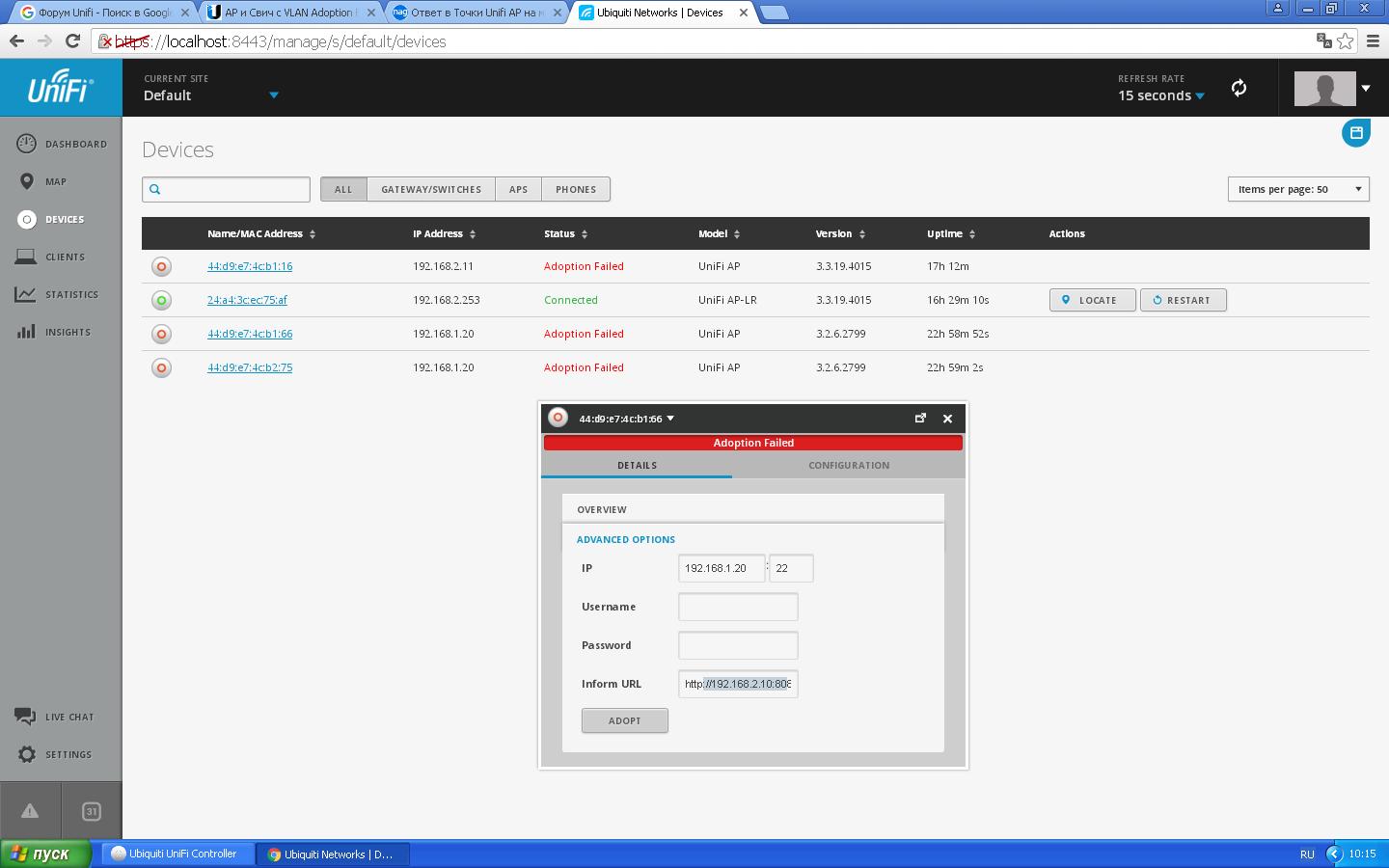 arturzil Posted April 1, 2016 (edited) Есть 2 свича Mikrotik Соединённые между собой Тигрированым каналом tagget VLAN10 VLAN20 VLAN30. Unifi AP и ПК контролер соединены между собой и сидят на VLAN20 untagged. Контролер UNifi находит устройства AP но он не может каким-то образом подключить точку подключенную к удаленному свичу. Устройство он видит пиненгует его даже видео ip adares Но в строке он висит красным цветом и пишет Adoption Failed. Если unifi AP подключить на один свич проблемы исчезают он зеленеет. Где мой косяк? Если проблема в mikrotik то в чем именно. Ведь сеть по сути у устройств общая только под VLAN20. Скорее всего загвоздка в самом UNIFI в прописи Контролера. Мой контролер ip 192.168.2.10 В Inform URL пробывал писать чистый IP контролера, не помогает. Пароль логин уже стандартный UBNT писал и свой не Коннектит. Читал на форумах что такая проблема существует на обычных свичах но толком решения не нашел. Edited April 1, 2016 by arturzil Share this post Link to post Share on other sites More sharing options...