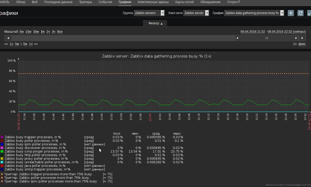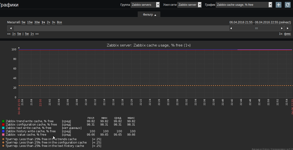 FATHER_FBI Posted April 6, 2016 Вы когда устанавливаете забикс, его сразу нужно ставить на мониторинг, используя шаблоны Template OS Linux и Template App Zabbix Server. Без мониторинга самого забикса, вы не знаете как он у вас работает и какие параметры нужно в конфиге крутить. Например мониторинг кеша Мониторинг пулеров Накрутите пулеров на максимум, сервер у вас кучу памяти сожрет. Судя по вашей ситуации на 2 версии, у вас скорей всего заканчивался кеш. Какой именно, можно узнать посмотрев данные с мониторинга. Ну и конечно же нужен тюнинг базы данных, что бы добиться примерно такого результата Share this post Link to post Share on other sites More sharing options...