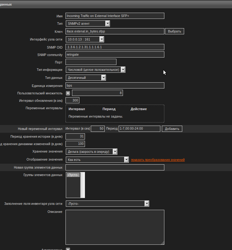 FATHER_FBI Posted April 5, 2016 1) В настройках графика "Функция" выбрал "Все". Изначально там было "Среднее". Ставил также MAX. Не помогло. 2) Деактивировал соответсвующие элементы на несколько минут. Потом активировал. Помогло на неторое время (минут 15). И снова не правильный график. Как будто со временем счетчики переполняются и все просто не влезает. 3) Изменил кол-во поллеров с 5 до 20, также timeout до 30. Еще увеличил значения различных кэшей. Все безрезультатно. Судя по этим телодвижениям, вы не умеете варить забикс. Покажите графики самого забикса, что бы можно было определить как он работает. И могу посоветовать вам, переходите на 3 версию, ее очень сильно оптимизировали. Share this post Link to post Share on other sites More sharing options...
