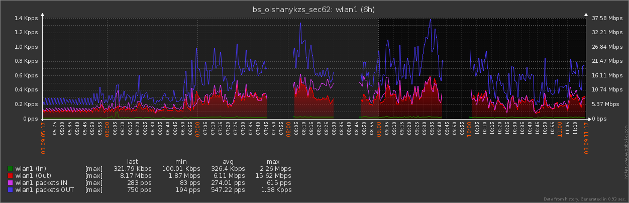 greenfox82 Posted April 5, 2016 (edited) Доброго времени суток. С некоторых пор возникла проблема с рисованием графика на Микротик. Рисую входящий и исходящий трафик на SFP+-интерфейсе (точнее скорость в сек). Поначалу все было ОК. Однако недавно заметил, что Заббикс показывает трафик меньше чем он есть на самом деле. К примеру сейчас показывает 378 Мбит/c, хотя на самом деле 1790 Мбит/c (если смотреть на самом МТ). В день когда график испортился ничего в заббиксе не делал и не перенастраивал. При этом на втором таком же МТ график показывает правильно. Если деактивировать этот элемент данных, а потом активировать снова, то некоторое время рисуется правильно, но через 20 минут, примерно, снова показывает на много меньше. В это время в логах заббикса ничего подозрительного, что касалось бы этого конкретного хоста не наблюдается. Обновлял РоутерОС, не помогло. Вот данные: Версия zabbix: 2.0.16 Mikrotik: CCR-1036-8G-2S+ (tile); Routeros: 6.34; Oid находил с помощью: /interface print oid R ;;; Uplink name=.1.3.6.1.2.1.2.2.1.2.1 actual-mtu=.1.3.6.1.2.1.2.2.1.4.1 mac-address=.1.3.6.1.2.1.2.2.1.6.1 admin-status=.1.3.6.1.2.1.2.2.1.7.1 oper-status=.1.3.6.1.2.1.2.2.1.8.1 bytes-in=.1.3.6.1.2.1.31.1.1.1.6.1 packets-in=.1.3.6.1.2.1.31.1.1.1.7.1 discards-in=.1.3.6.1.2.1.2.2.1.13.1 errors-in=.1.3.6.1.2.1.2.2.1.14.1 bytes-out=.1.3.6.1.2.1.31.1.1.1.10.1 packets-out=.1.3.6.1.2.1.31.1.1.1.11.1 discards-out=.1.3.6.1.2.1.2.2.1.19.1 errors-out=.1.3.6.1.2.1.2.2.1.20.1 Счетчик 64-битный: root@logsrv:/etc/zabbix# snmpwalk -v2c -c retngate 172.16.128.114 .1.3.6.1.2.1.31.1.1.1.6.1 iso.3.6.1.2.1.31.1.1.1.6.1 = Counter64: 384782403213432 Попробовал ручками опросить соответсвующий параметр, а именно входящий трафик и посчитал. root@logsrv:/var/log/zabbix# snmpwalk -v2c -c retngate 172.16.128.114 .1.3.6.1.2.1.31.1.1.1.6.1 iso.3.6.1.2.1.31.1.1.1.6.1 = Counter64: 388615694076202 Примерно через секунду снова: root@logsrv:/var/log/zabbix# snmpwalk -v2c -c retngate 172.16.128.114 .1.3.6.1.2.1.31.1.1.1.6.1 iso.3.6.1.2.1.31.1.1.1.6.1 = Counter64: 388615967356851 Потом посчитал так: 388615967356851 - 388615694076202 = 273280649 * 8 = 2186245192 / 1000000000 = 2,186 Гбит в сек. Примерно совпало с тем, что показывает роутер. Видимо snmp отрабатывает как надо. Что-то не так именно в заббиксе. Правильно я вообще посчитал? Что еще делал: 1) В настройках графика "Функция" выбрал "Все". Изначально там было "Среднее". Ставил также MAX. Не помогло. 2) Деактивировал соответсвующие элементы на несколько минут. Потом активировал. Помогло на неторое время (минут 15). И снова не правильный график. Как будто со временем счетчики переполняются и все просто не влезает. 3) Изменил кол-во поллеров с 5 до 20, также timeout до 30. Еще увеличил значения различных кэшей. Все безрезультатно. Помогите! Edited April 5, 2016 by greenfox82 Share this post Link to post Share on other sites More sharing options...