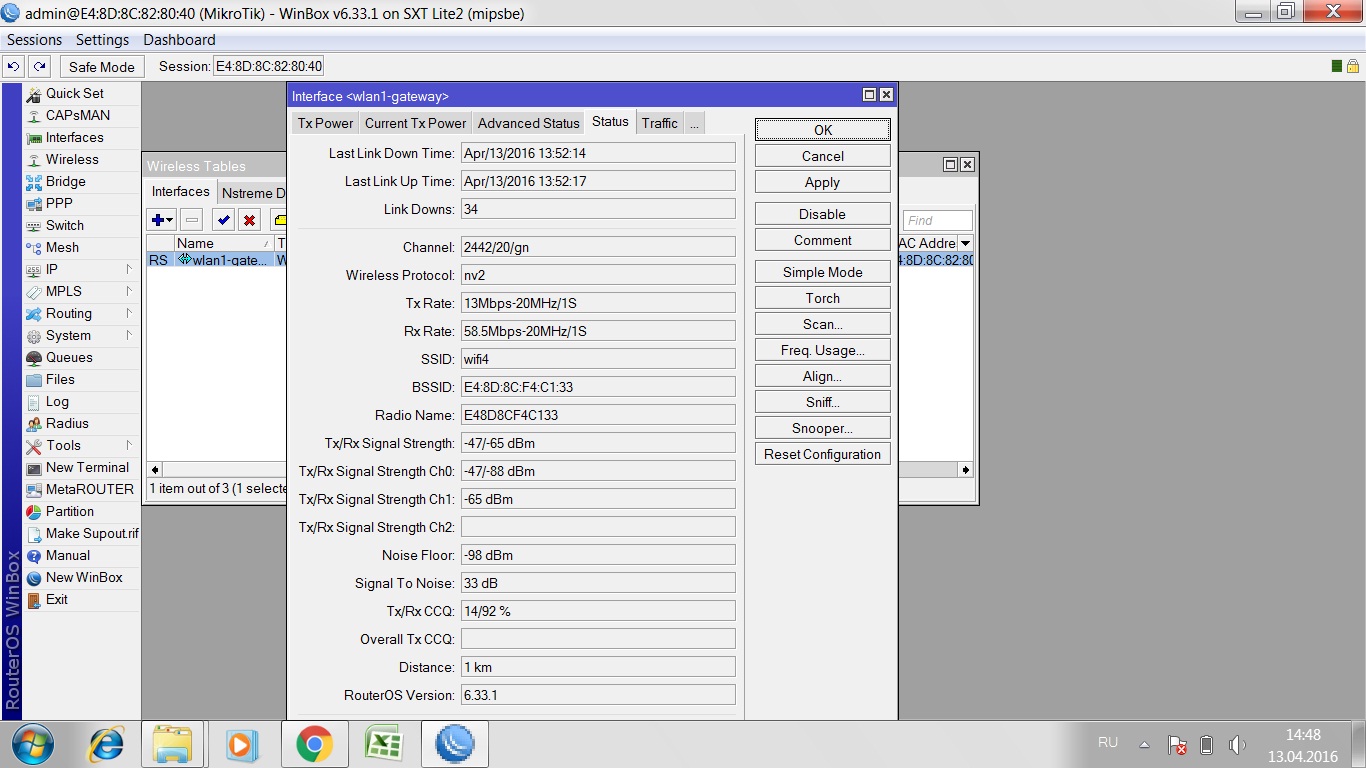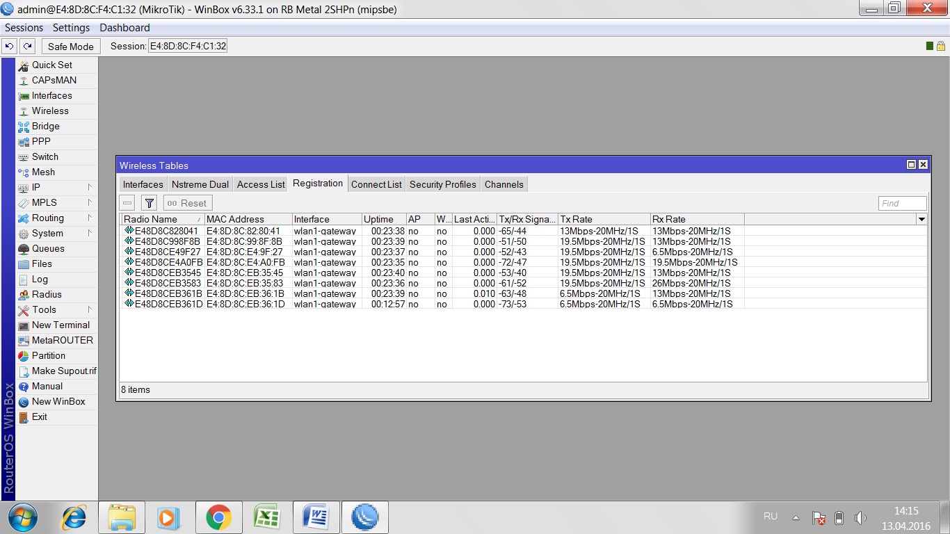 U10T Posted April 13, 2016 (edited) Антенна подключенная к Металу - всенаправленная из комплекта поставки. по поводу 14дбм понял, будем перенастраивать. На метале один канал, поэтому галочки надо ставить у 0-7, и снимать верхние для уменьшения максимальных скоростей. На Метале2 во вкладке HT MCS поставили галочки только в 0-7 в обоих полях HT Supported MCS и HT Basic MCS. Галочки 8-15 убрали. на абонентских устройствах (SXT Lite2) все оставили в исходном т.е. не трогали Data Rates, по умолчанию стоят галочки на HT Supported MCS и HT Basic MCS. Мощность на Метале2 - 18дбм, мощность у абонентов снизили до 20дбм на расстоянии до 200-250метров. Проблема с абонентом на удалении 400 метров осталась. У него даже при мощности 25-28дбм скорость на приеме не более 2,8мбит/с и на отдаче 0,3мбит/с. Понижаем у него мощность до 20дбм скорость - 0,34мбит/с на 0,1мбит/с. При этом у других абонентов (40 до 250 метров) скорость в норме. На абонетском устройстве (400 метров удаление) поставили галочки только в 0-7 в обоих полях HT Supported MCS и HT Basic MCS. Галочки 8-15 убрали. Картина не изменилась. выкладываю вкладку Registration и вкладку Status у абонента Edited April 13, 2016 by U10T Вставить ник Quote Ответить с цитированием Share this post Link to post Share on other sites More sharing options...
