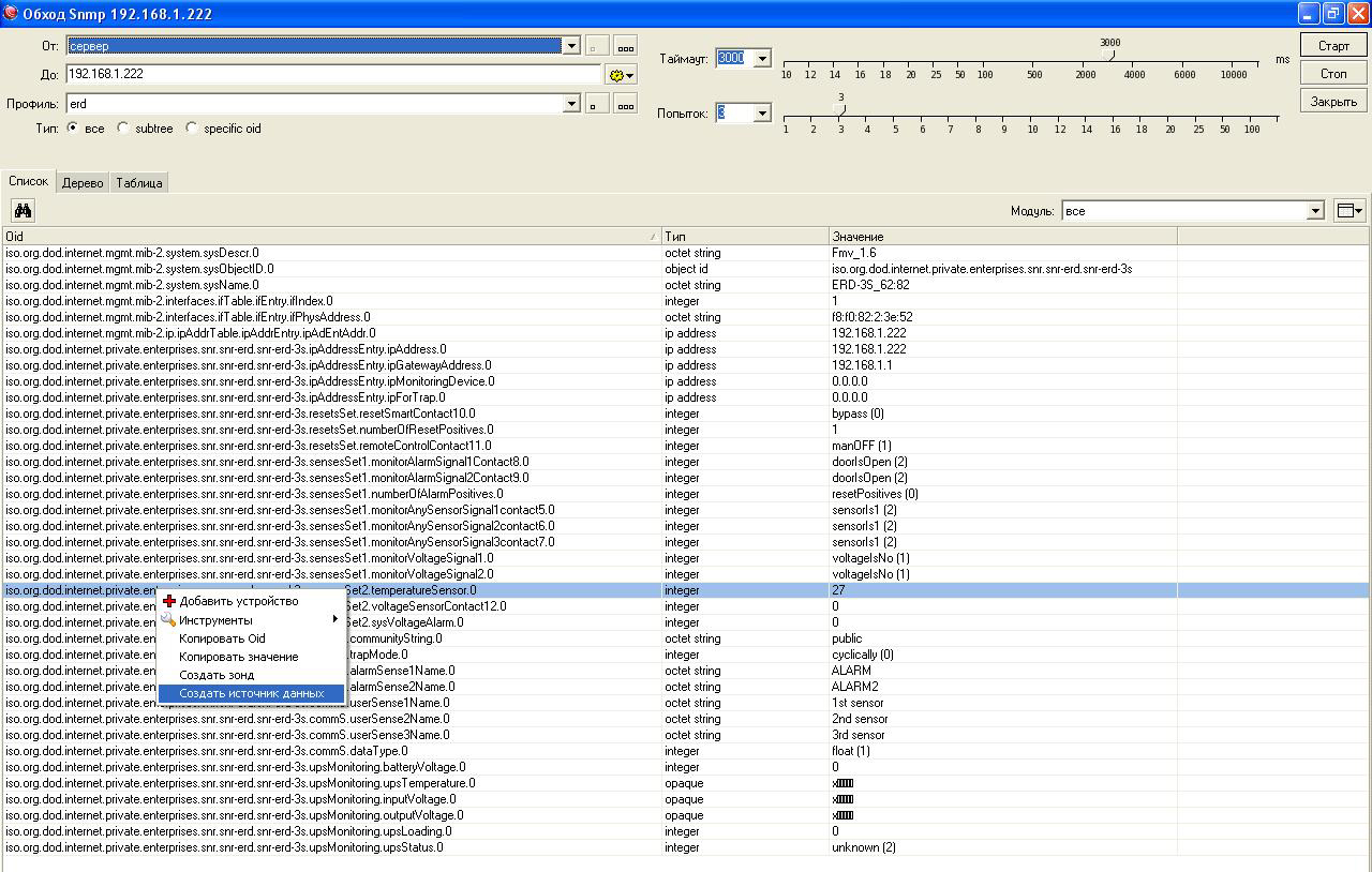 alexnasa Posted November 30, 2016 Posted November 30, 2016 (edited) Три дня бьюсь- не могу подружить ERD-3S 62:82 Firmware 1.6 и The Dude 4.0 beta 3.. Остальное работает ок! И Герда подключилась работает ОК. И в комстроке получаю температуру встроенного датчика вот так: SnmpGet.exe -r:192.168.1.222 -t:10 -c:"public" -o:.1.3.6.1.4.1.40418.2.4.4.1 OID=.1.3.6.1.4.1.40418.2.4.4.1.0 Type=Integer Value=26 (SnmpGet v1.01 - Copyright © 2009 SnmpSoft Company) Инструкцию эту http://shop.nag.ru/article/nastrojka-zaprosa-parametrov-s-ustrojstv-snr-erd-po-protokolu-snmp-v-programme-dude-versiya-4 я не просто прочел- наизусть выучил, но не получается по инструкции.. Мне не подходит этот синтаксис в хелпе?- в строке «Код» вписать OID запрашиваемого параметра (oid_raw(«1.3.6.1.4.1.40418.2.2.4.1»)) Ведь если его весь заменить, на пару цифр, напр. "25", то график появляется! То ли файл SNR-ERD-3S.mib надо в Dude как-то прописать?Заработало.. правильный OID , для показаний встроенного датчика температуры- (oid_raw("1.3.6.1.4.1.40418.2.4.4.1.0")) я получил от устройства силами Dude, воспользовавшись, по правой клавише мыши, встроенным инструментом SNMPWalk (среди "пинг;трасерт и т п") и далее в обнаруженных SNMP каналах, выбрать нужный и "создать источник данных" (он появится в Charts) или можно маяк- "зонд" создать, подобный пингу. Edited November 30, 2016 by alexnasa Вставить ник Quote