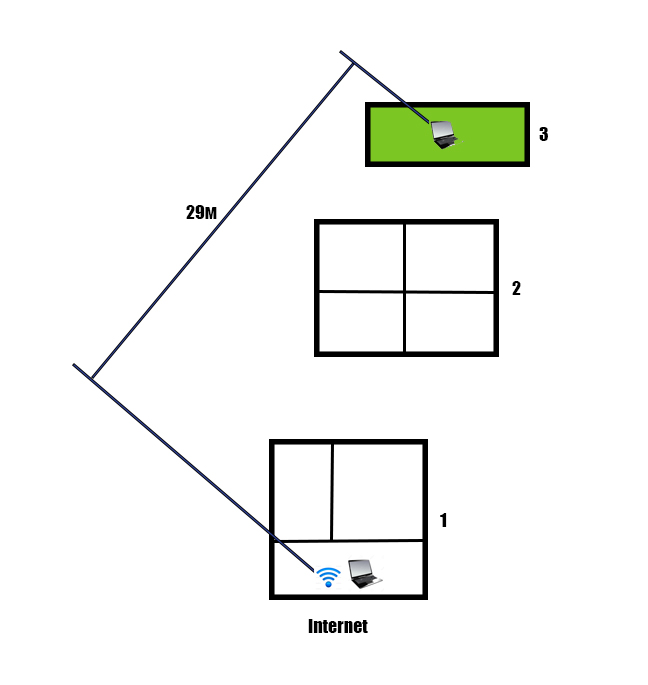 strannik.evg Posted April 14, 2016 Posted April 14, 2016 (edited) Всем привет! Сильно не пинайте новичка. Нарисовал схему для наглядности. Село, частные одноэтажные холупы дома (саман (глина с палками и соломой) + обложены кирпичом. Инет через оптоволокно заведен в дом 1. Нужно максимально дешево организовать зону Wifi в доме 3 (либо на худой конец чтобы там ловил адаптер типа Tp link 722, может с самодельным биквадратом). Расстояние по прямой 29м. Дом 2 доступен, можно ставить оборудование как угодно. Вариант с витой парой не подходит, т.к. хозяин дома 1 согласен только поставит роутер/точку доступа возле своего компа, куда ему протянули инет, никаких проводов, сверлений и т.д. Пробовал ставить тп линк 841, так он даже в доме 2 ноутбуком почти не ловится. Думаю взять б/у Nanostation2 за $25-30. Пробьет он сквозь несколько стен? Можно будет пользоваться нетом без адаптера в 3 доме? И еще дилетантский вопрос: т.к. это ТД с одним LAN разъемом, нужен ли дополнительно роутер, если не подключать никого кабелем, чтоб хозяин дома 1 тоже мог юзать wifi? Или это все стрельба из пушки по воробьям и можно организовать проще/дешевле? На бытовых роутерах/ТД, поставить какой-нибудь репитер в доме 2. Или нормальный роутер в доме 1 и адаптер в доме 3 с самодельным биквадратом или даже банкой)) Edited April 15, 2016 by strannik.evg Вставить ник Quote