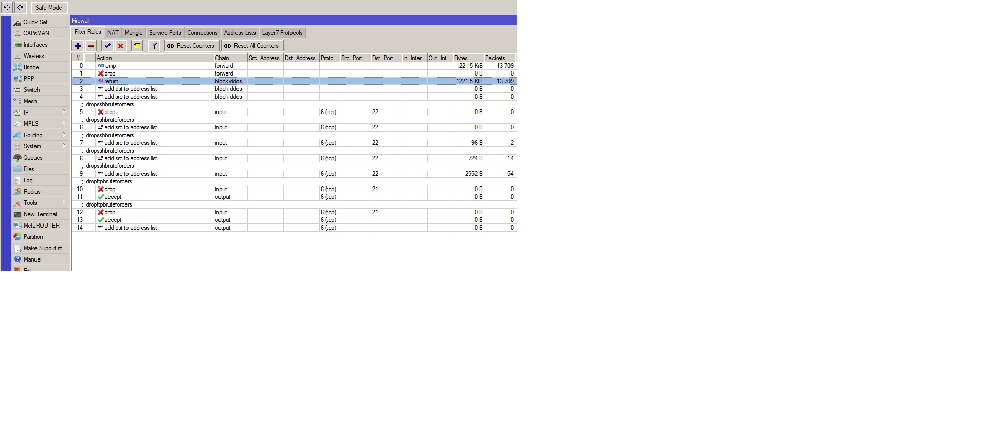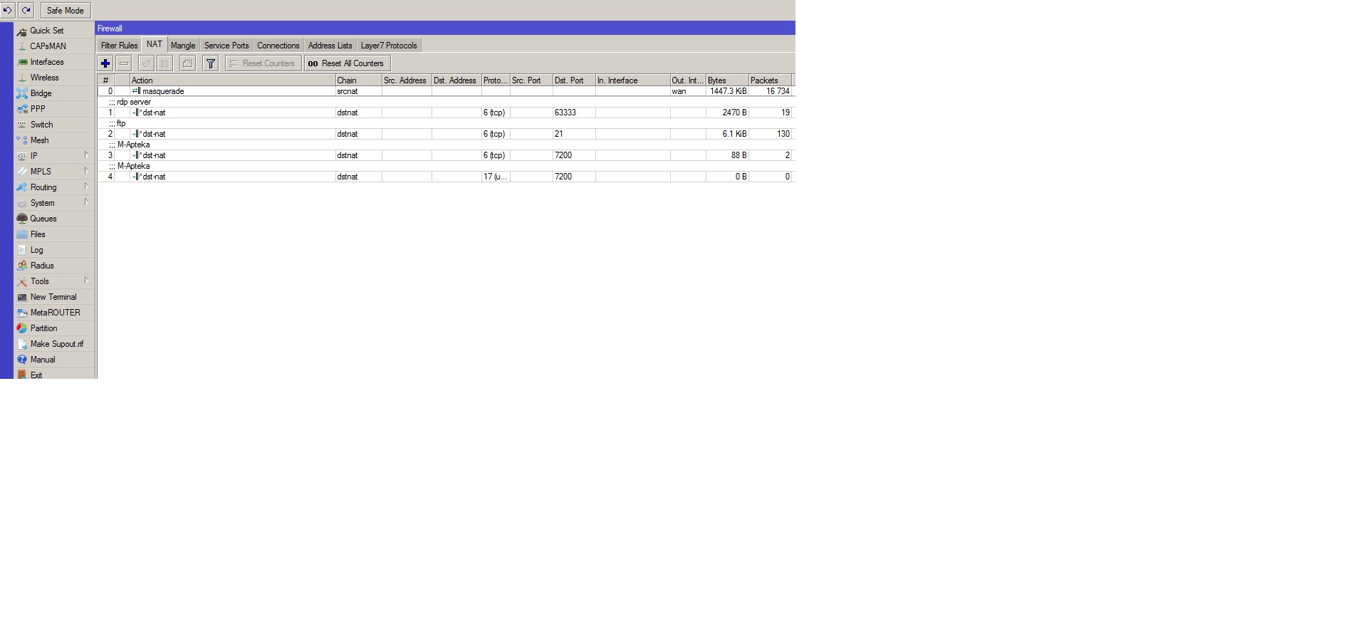 dovgancorp Posted April 21, 2016 Posted April 21, 2016 Здравствуйте, прошу помощи. Есть RB951 для локальной сети предприятия (10 машин), поставили вместо Netgear jwnr2000. Перестала работать исходящая почта с программы theBat на сервер провайдера. в настройках клиента (в бате) стояли порты 465 на smtp и 110 на pop3. Хотя до смены рутера всё работало :) (ну как обычно). Позвонил провайдеру - сказали что у них на 465 вообще ничего не весит, ставь 25, окей, поставил - входящая стала нормально отрабатывать, исходящая по прежнему не пашет, игралса с галочками типов аутентификации в бате (tls, обычная и т.д.) - не помогло. Запрещающих правил вроде нет. Настроены порты на проброс рдп и еще пару служб для местных программ в локалке. Прошивка 6.35. Настройки firewall и nat во вложении. Подскажите пожалуйста, где ошибка и чего не хватает? Вставить ник Quote
