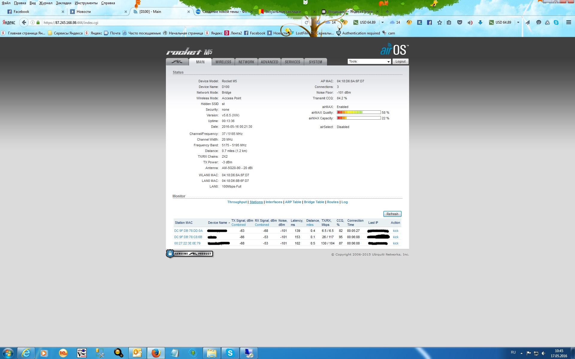 gaz-tormozov Posted May 17, 2016 Ситуация такая, есть рокет м5 с секторной антеной, к нему на расстоянии менее 1 км цепляются три нанобриджа м5, так вот началась чехорда, перегружаешь рокет скороссть показывает 130/130 через некоторое время уже 6.5/6.5 связь еле ползает, что может происходить. прошивки везде свежие 5.6.5 уже не знаю куда копать. Share this post Link to post Share on other sites More sharing options...