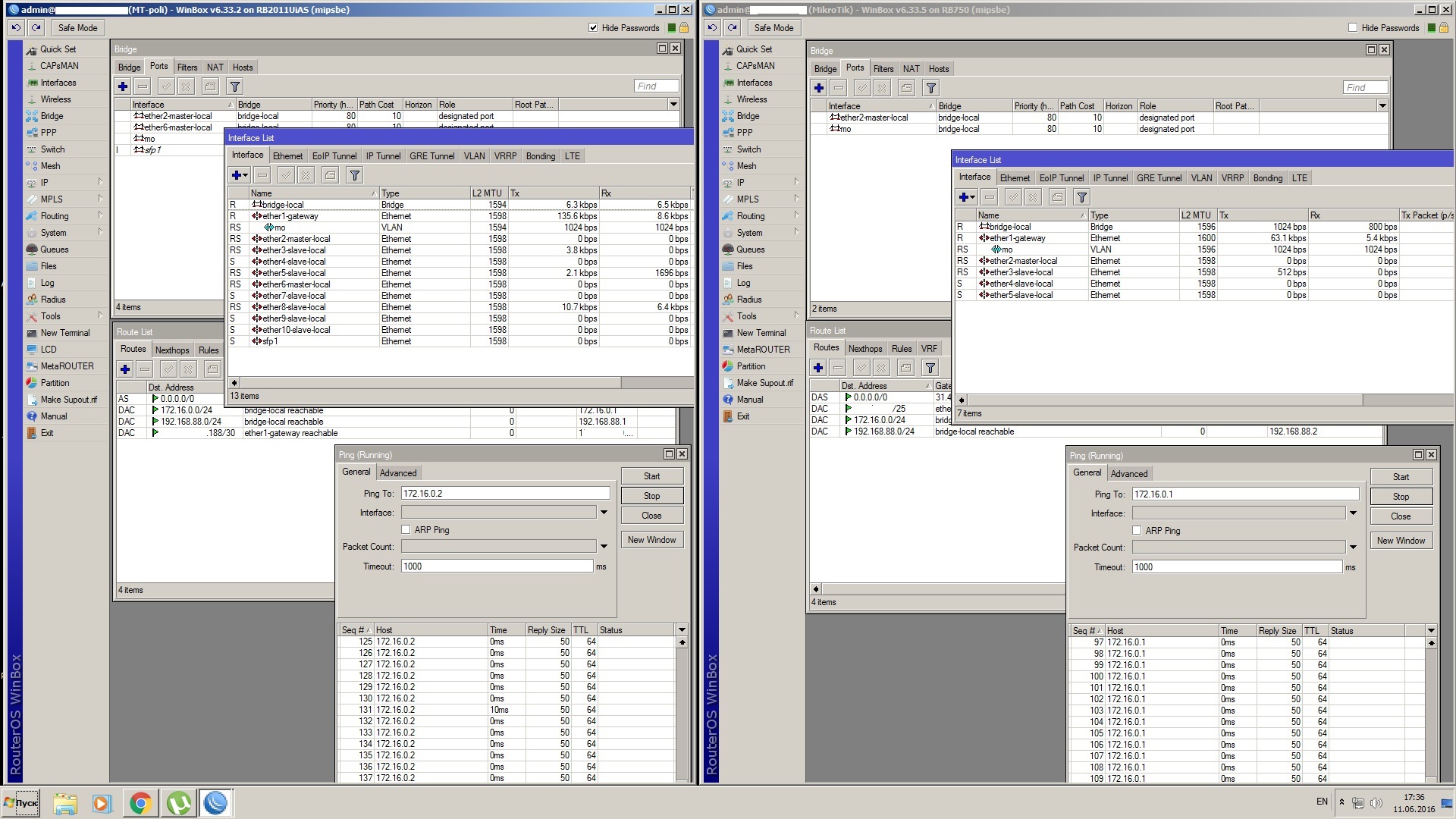 Andriyll Posted June 11, 2016 Posted June 11, 2016 (edited) Всем привет. помогите решить проблему. Не могу объединить офисы. Есть несколько офисов один главный, инет через одного провайдера, ай пи статическая только на главном ( пров по каким то только ему понятных причинах не может дать статику на остальные ) но пров. прокинул VLAN между ими . На одном микротике на интерфейсе который смотрит на провайдера создал ВЛАН интерфейс присвоил ему айпи, на другом аналогично , инерфейсы ВЛАН запихнул в бридж к локальным портам. С одного на другой ВЛАНы пингуются , какой то мизерный трафик бегает. Но с одной сети в другую ничего не видно и нет пинга. Не могу понять что я пропустил. Буду очень благодарен за помощь. Добавил скрин где пинги таки идут . Конфиг одного и второго микротика тут http://www92.zippyshare.com/v/pbLQyK7V/file.html Edited June 11, 2016 by Andriyll Вставить ник Quote