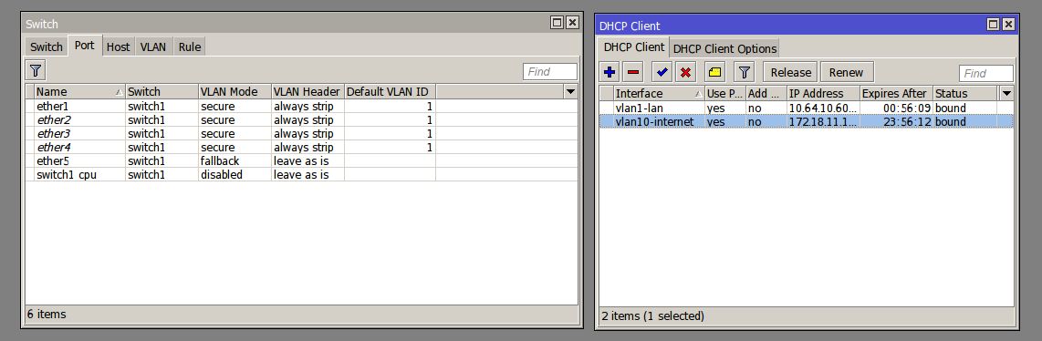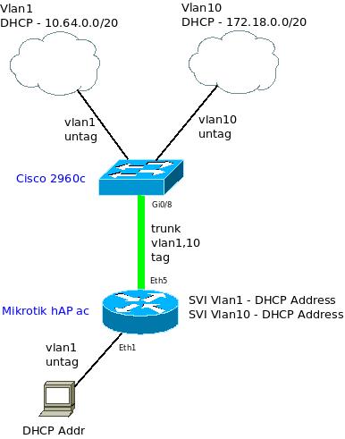 SOs Posted June 22, 2016 Author Posted June 22, 2016 (edited) Сделал [admin@MikroTik] > /interface ethernet switch port print Flags: I - invalid # NAME SWITCH VLAN-MODE VLAN-HEADER DEFAULT-VLAN-ID 0 ether1 switch1 secure always-strip 1 1 ether2 switch1 secure always-strip 1 2 ether3 switch1 secure always-strip 1 3 ether4 switch1 secure always-strip 1 4 ether5 switch1 FALLBACK leave-as-is auto 5 switch1-cpu switch1 disabled leave-as-is auto И ПК через eth1 получил аренду. Итоговый конфиг /interface vlan add interface=ether5 name=vlan1-lan vlan-id=1 add interface=ether5 name=vlan10-internet vlan-id=10 /interface ethernet set [ find default-name=ether1 ] master-port=ether5 set [ find default-name=ether2 ] master-port=ether5 set [ find default-name=ether3 ] master-port=ether5 set [ find default-name=ether4 ] master-port=ether5 /interface ethernet switch port set 0 default-vlan-id=1 vlan-header=always-strip vlan-mode=secure set 1 default-vlan-id=1 vlan-header=always-strip vlan-mode=secure set 2 default-vlan-id=1 vlan-header=always-strip vlan-mode=secure set 3 default-vlan-id=1 vlan-header=always-strip vlan-mode=secure set 4 vlan-mode=fallback /interface ethernet switch vlan add independent-learning=no ports=ether1,ether2,ether3,ether4,ether5,switch1-cpu switch=switch1 vlan-id=1 add independent-learning=no ports=ether5,switch1-cpu switch=switch1 vlan-id=10 /ip dhcp-client add add-default-route=no dhcp-options=hostname,clientid disabled=no interface=vlan1-lan add add-default-route=no dhcp-options=hostname,clientid disabled=no interface=vlan10-internet Получается, что мы отключили строгую обработку тэгов на eth5. Но кроме 1 и 10 ВЛАНа в транке ничего не должно ходить... Конфиг порта циски: interface GigabitEthernet0/8 switchport trunk native vlan 999 switchport trunk allowed vlan 1,10 switchport mode trunk spanning-tree portfast Нэтив ВЛАН выключен, т.е. 1 и 10 тэгируются. Edited June 22, 2016 by SOs Вставить ник Quote