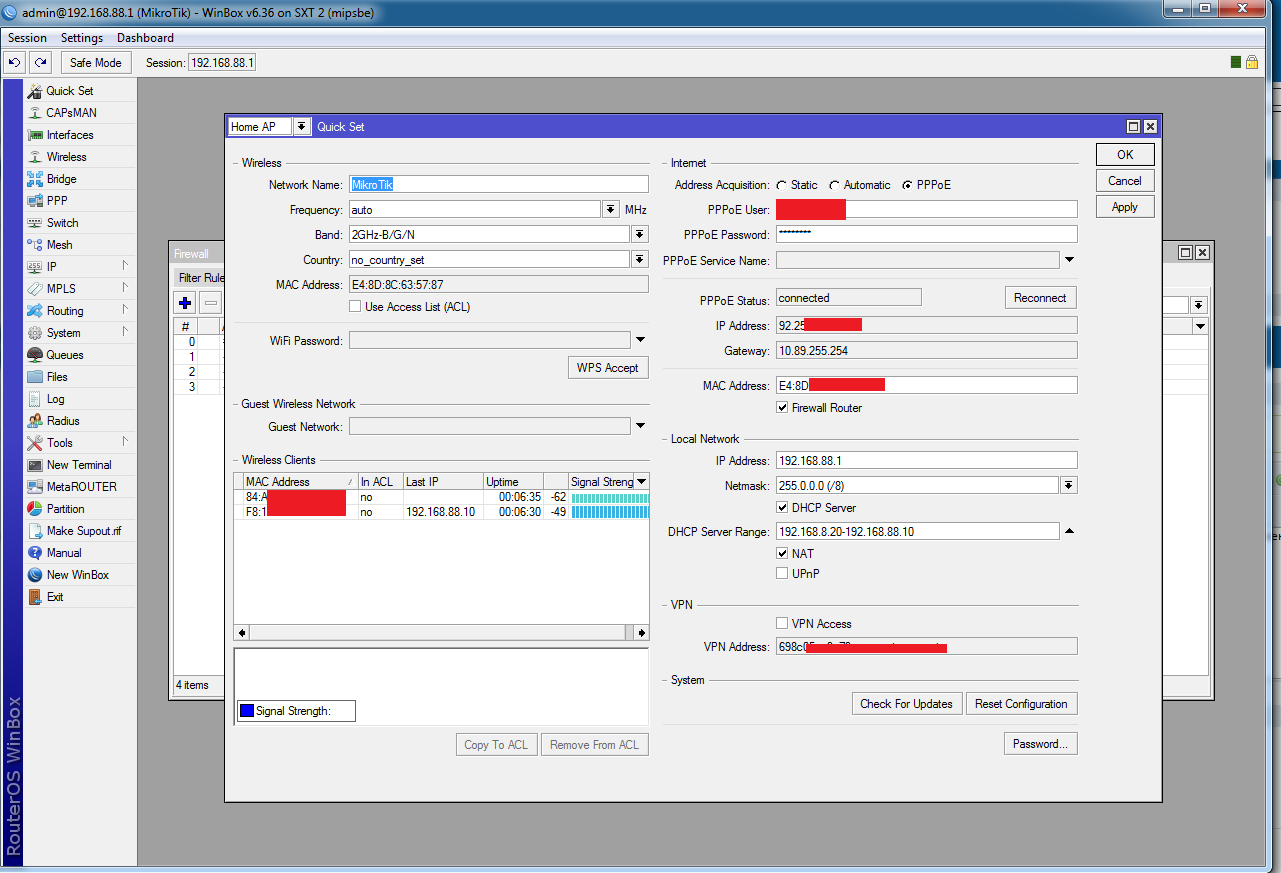 borodadada Posted August 24, 2016 Posted August 24, 2016 Уважаемые, помогите разобраться. Установил SXT2 в качестве "главного", есть на нём подключение к интернету pppoe. Клиент wi-fi на Lite2. Интернет работает, не могу пробросить порты. Вот скриншоты. Везде читал, всё одно и тоже, у меня не работает. Вставить ник Quote