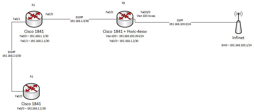 fractal Posted August 26, 2016 Author Posted August 26, 2016 (edited) Вообщем вот схема, в итоге конфигурация такая Infinet #Interfaces parameters ifc lo0 127.0.0.1/32 ifc eth0 media auto mtu 1500 up ifc eth0 192.168.100.1/24 ifc rf5.0 down ifc rf5.0 192.168.200.1/28 #OSPF configuration ospf start ospf interface eth0 ospf interface lo0 ospf interface null0 ospf interface rf5.0 ospf router ospf passive-interface lo0 ospf passive-interface null0 ospf auto-interface rf5.0 area 0.0.0.0 ospf network 192.168.100.0/24 area 0.0.0.0 ospf end R3 interface FastEthernet0/0 ip address 192.168.1.2 255.255.255.252 duplex auto speed auto ! interface FastEthernet0/1 no ip address shutdown duplex auto speed auto ! interface FastEthernet0/0/0 switchport access vlan 100 ! interface FastEthernet0/0/1 switchport trunk allowed vlan 1,2,1002-1005 switchport mode trunk shutdown ! interface FastEthernet0/0/2 ! interface FastEthernet0/0/3 ! interface FastEthernet0/1/0 ! interface FastEthernet0/1/1 ! interface FastEthernet0/1/2 ! interface FastEthernet0/1/3 ! interface Vlan1 no ip address ! interface Vlan100 description -- mngt -- ip address 192.168.100.254 255.255.255.0 ! router eigrp 100 traffic-share min across-interfaces redistribute connected metric 102400 1 255 1 1500 redistribute static metric 102400 1 255 1 1500 redistribute ospf 100 metric 102400 1 255 1 1500 passive-interface default no passive-interface FastEthernet0/0 network 192.168.1.0 0.0.0.3 no auto-summary neighbor 192.168.1.1 FastEthernet0/0 ! router ospf 100 log-adjacency-changes traffic-share min across-interfaces passive-interface default no passive-interface Vlan100 network 192.168.1.0 0.0.0.3 area 0 network 192.168.100.0 0.0.0.255 area 0 R2 interface FastEthernet0/0 ip address 192.168.1.1 255.255.255.252 duplex auto speed auto ! interface FastEthernet0/1 ip address 192.168.2.1 255.255.255.252 duplex auto speed auto ! router eigrp 100 traffic-share min across-interfaces redistribute connected metric 102400 1 255 1 1500 redistribute static metric 102400 1 255 1 1500 passive-interface default no passive-interface FastEthernet0/0 no passive-interface FastEthernet0/1 network 192.168.1.0 0.0.0.3 network 192.168.2.0 0.0.0.3 no auto-summary neighbor 192.168.1.2 FastEthernet0/0 neighbor 192.168.2.2 FastEthernet0/1 R1 interface FastEthernet0/0 ip address 192.168.2.2 255.255.255.252 duplex auto speed auto ! interface FastEthernet0/1 ip address 192.168.3.1 255.255.255.252 duplex auto speed auto ! router eigrp 100 traffic-share min across-interfaces redistribute connected metric 102400 1 255 1 1500 redistribute static metric 102400 1 255 1 1500 passive-interface default no passive-interface FastEthernet0/0 network 192.168.2.0 0.0.0.3 no auto-summary neighbor 192.168.2.1 FastEthernet0/0 с R1 пингуются все сети инфинета, а инфинет пингует только подсеть 192.168.1.0/30 и далее не ходит, если на инфинете прописать route add default 192.168.1.254 (Vlan100 - Управление инфинетом) то он начинает пинговать все сети Edited August 26, 2016 by fractal Вставить ник Quote