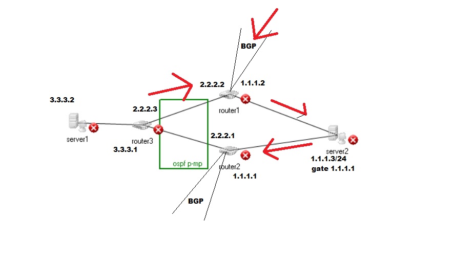 WY6EPT Posted August 31, 2016 Author Posted August 31, 2016 1) Вы ведь не планируете fv залить в OSPF? вам по идее BGP должен отпускать вниз дефолт в OSPF, вот и все, а OSPF поднимать вверх публичную адресацию... 2) Почему у вас на двух линках в сторону сервера одинаковая подсеть? всё правильно, я не враг себе, что бы в ospf FW заливать. тут только вопрос с тем, как ospf проглотит два маршрута вверх через два сервера. а вот из-за одинаковой подсети весь сырбор. я хочу поставить скрипт, что бы в случае неответа маршрутизотора 2, на маршрутизаторе 1 прописывался адрес 2го, есть такая функция. вот и возник вопрос. а если пакет приедет по другому пути, как это воспримет сервер? я уже конечно подумываю о том, что бы переключать интерфейсы скриптом и не мучаться Вставить ник Quote