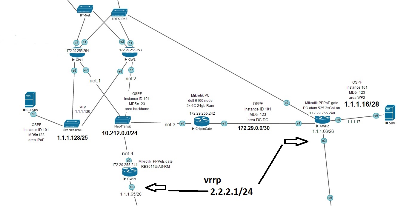WY6EPT Posted October 4, 2016 Author Posted October 4, 2016 (edited) Подниму тему из забвенья. начальный вопрос решился тестами. зато пришел вопрос с VRRP откуда не ждали. и так. есть два роутера ( микротик, но не суть) поднят vrrp на подсеть 2.2.2.0/24 всё работает, всё хорошо.. но - на роутере GWP1 что то случилось с провайдером, но линк есть. - роутер GWP2 понимает, что его сосед упал и поднимает интерфейс в ospf публикуется сеть 2.2.2.0/24 - GWP1 считает, что ему норм и подсеть 2.2.2.0/24 из ospf убирать не собирается так, как маршрутизаторам GW1 и GW2 до маршрутизатора GWP2 далеко ( лишний hope) они шлют пакеты в GWP1... а там пусто. вопрос, есть ли какие то встроенные методы проверки доступности канала и отключение VRRP в такой ситуации? upd может кто прикручивал BFD к VRRP с целью потушить последнего? Edited October 4, 2016 by WY6EPT Вставить ник Quote