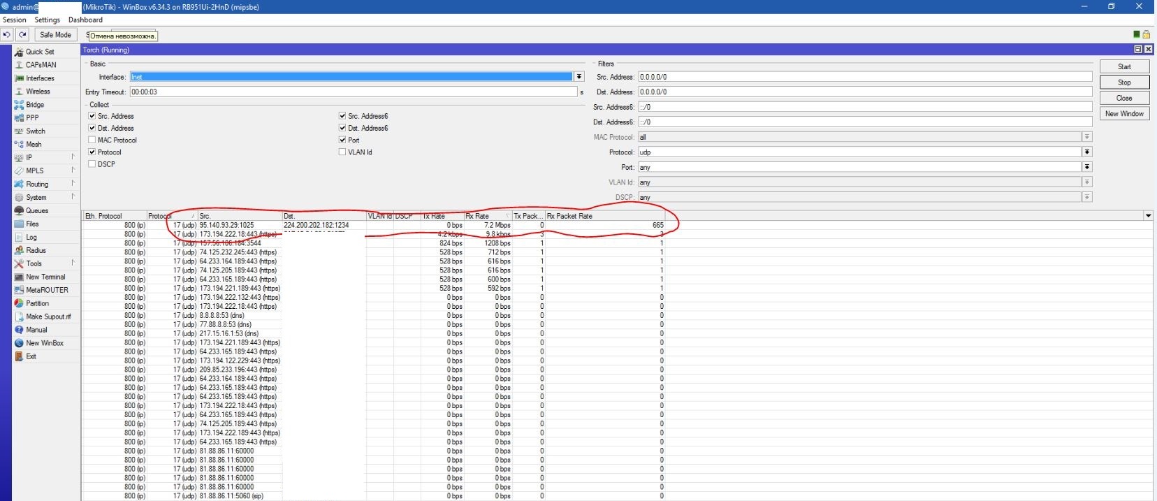 LexusXX Posted September 6, 2016 Posted September 6, 2016 (edited) Добрый день. Стоит у клиента роутер MikroTik RB951G-2HnD. Вчера началось очень странное поведение. Канал провайдера забит на 7 мб из 10. Сделал torch на интерфейсе смотрящий в инет, и увидел там соединение, которое идет с "левого" адреса на "левый" адрес (на на IP железки) То есть с ip 95.140.93.29:1025 идет соединение на ip 224.200.202.182:1234 со скоростью Rx Rate 7,2 Mbps и так как это соединение попадает только в prerouting ни чего с ним сделать я не могу. DNS из вне закрыт на firefall правилом Помогите советом, что это такое и как это победить. Спасибо Edited September 6, 2016 by LexusXX Вставить ник Quote