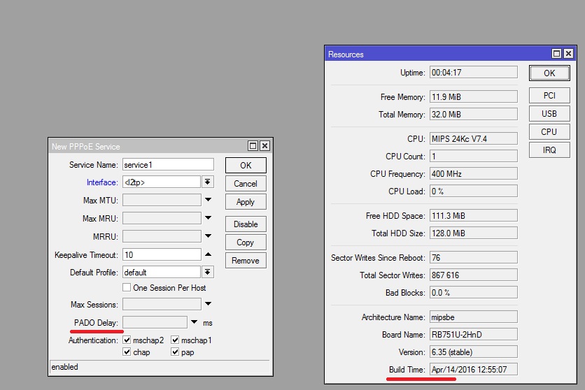 nkusnetsov Posted September 14, 2016 (edited) От скуки набросал тут скриптик. Отличается операцией xor значения в множителе pad-delay. Предполагает, что pppoe сервер один на устройстве. Иначе, после "set" вместо "0" надо добавлять конструкцию типа [find service-name=имя]. Множитель задержки сейчас 10, далее подбираем по обстановке. Ставим в шедулер. Запускаем раз в минуту. Или раз в пять(или любое нечетное количество) минут - по вкусу. Для первого: # Current minute as NUM vale :local t1 [:tonum [:pick [/sys clock get time] 3 5]] # Binary AND then XOR with minute. Check odd/even minute and set pado-delay /int pppoe-s serv set 0 pado-delay=(1+($t1&1^1)*10) И для второго. # Current minute as NUM vale :local t1 [:tonum [:pick [/sys clock get time] 3 5]] # Binary AND with minute. Check odd/even minute and set pado-delay /int pppoe-s serv set 0 pado-delay=(1+($t1&1)*10) Edited September 14, 2016 by nkusnetsov Вставить ник Quote Ответить с цитированием Share this post Link to post Share on other sites More sharing options...